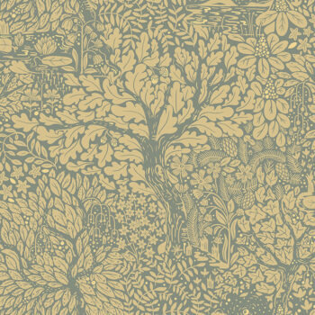 This stunning botanical wallpaper will transport you on a magical, moonlight stroll through the forest! Mature oaks are surrounded by lush woodland greenery, the scene illustrated in pale yellow brushed with metallic gold along a moody, teal backdrop. Olle is an unpasted, non woven wallpaper.