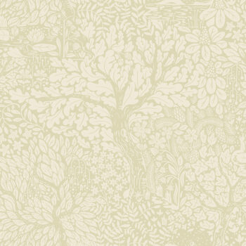 This Scandinavian-inspired wallpaper will bring a sense of deep serenity to your space. A mature oak forest is filled with wildflowers, the details illustrated in white along a sandy-beige backdrop. Olle is an unpasted, non woven wallpaper.