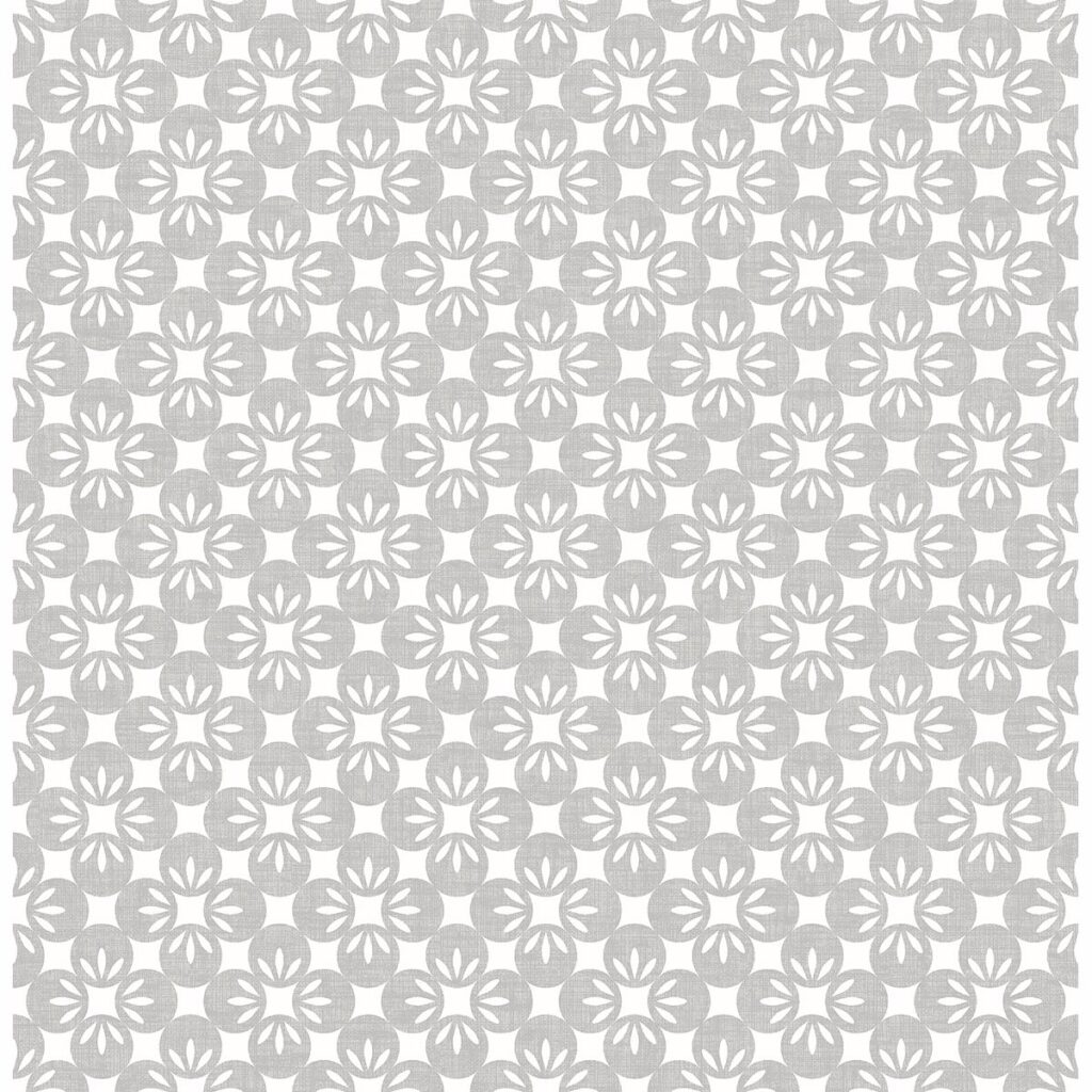 This geometric wallpaper is all in the eye of the beholder. A medley of designs from flowers to ferns to moons can be seen in this design. The modern color palette mixes with a vintage print for a contemporary effect. A subtle texture creates depth within they grey 1.25 inch dots.