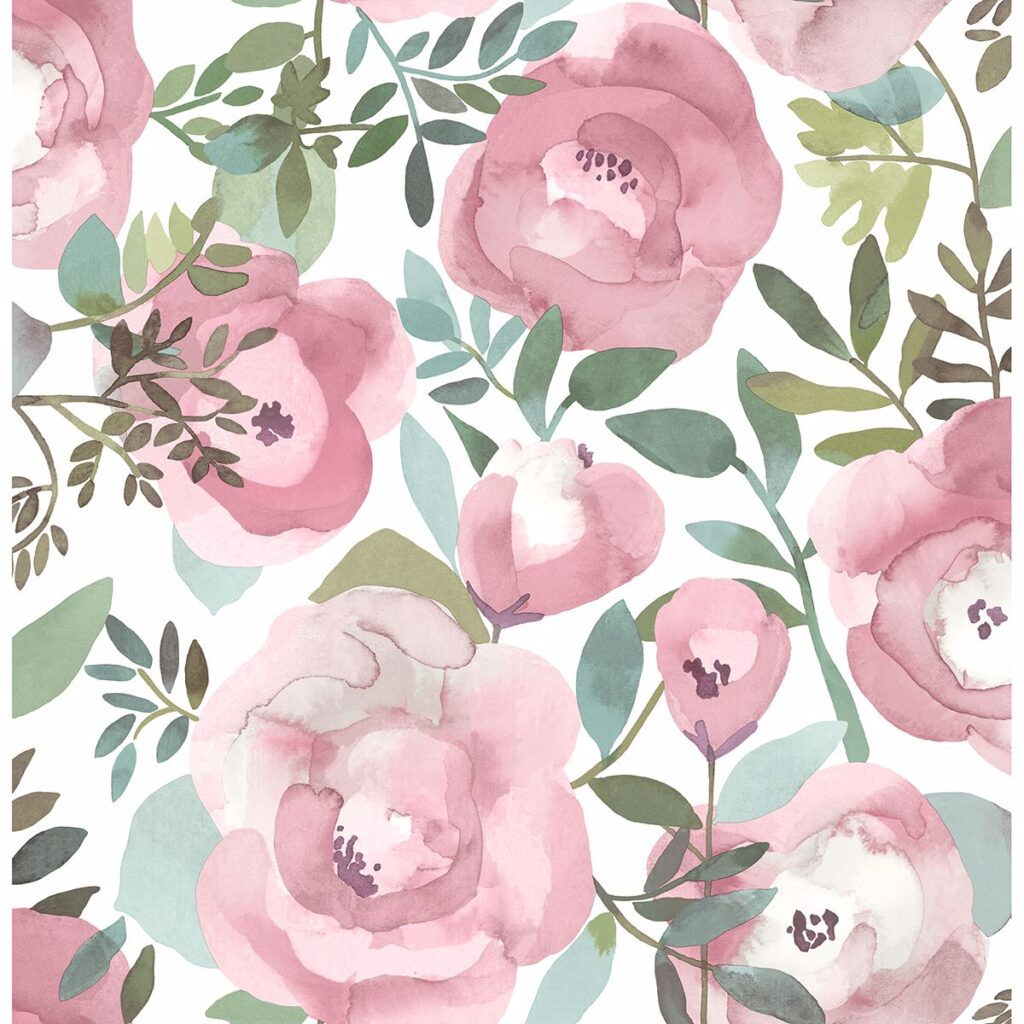 Darling pink roses with curling green leaves pop against a crisp white background in this sweet wallpaper. Its gorgeous watercolor design emphasizes its whimsical and vintage style. Orla is an unpasted, non woven wallpaper.