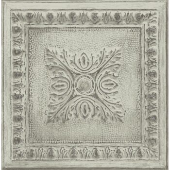 The large-scale pattern of this wallpaper makes for an impressive display. Metallic silver ink meshes beautifully with the soft sea foam color of the faux tiles. Designed to resemble vintage tin, this pattern is the perfect balance of traditional and modern.