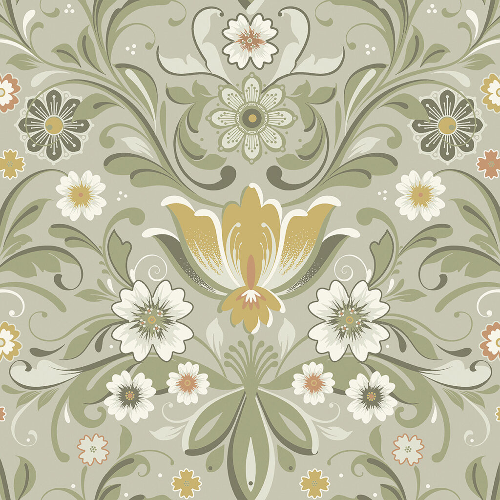 Bring 70s-inspired extravagance to your walls with this groovy floral design. The stylized florals are framed by curling scroll leaves, inked in an earthy palette of green, gold, white, coral, and grey. Ostanskar is an unpasted, non woven wallpaper.