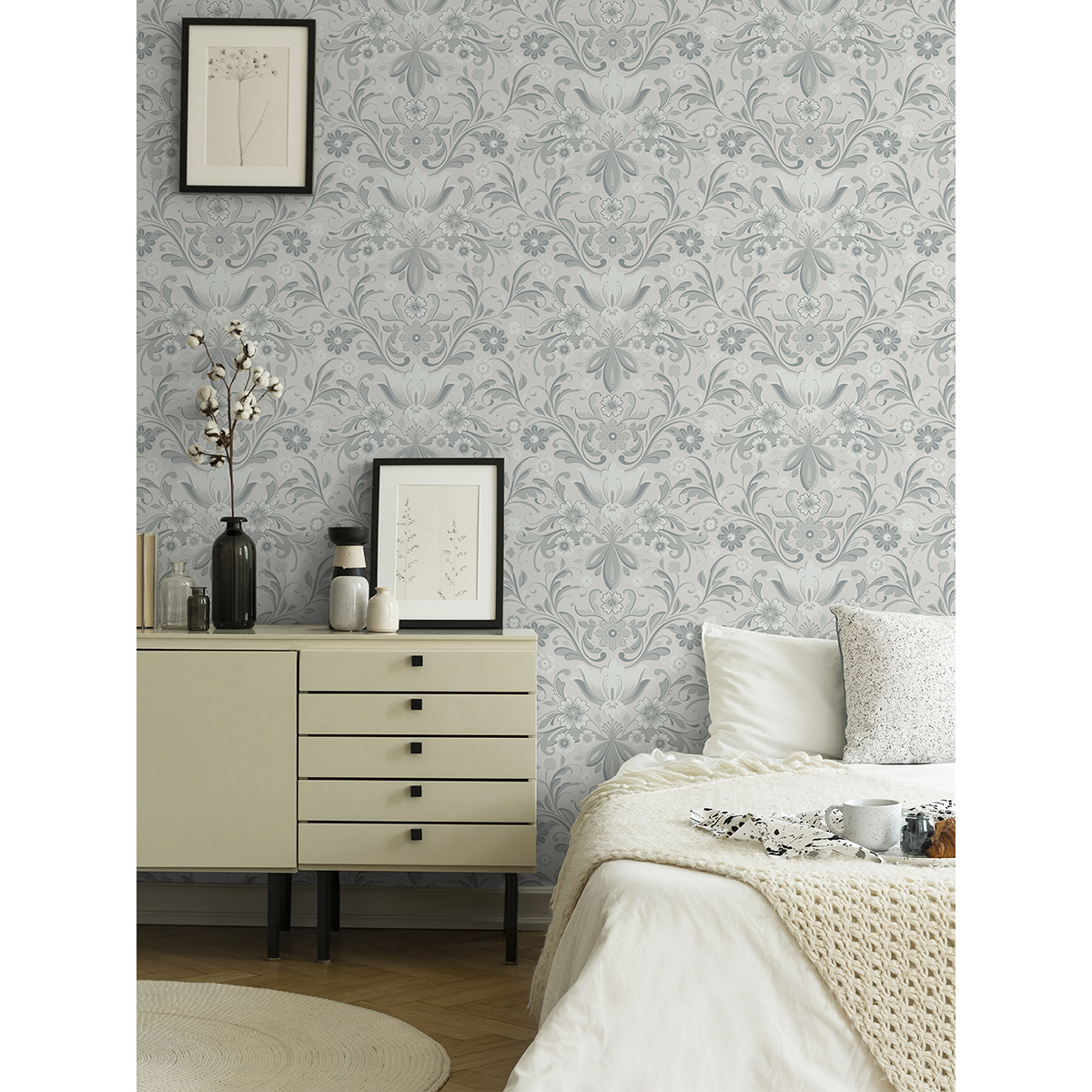 Bring some funky 70’s flair to your home with this floral wallpaper! The stylized flowers are framed by scroll leaves, the grey color palette adding simple elegance to this eclectic design. Ostanskar is an unpasted, non woven wallpaper.