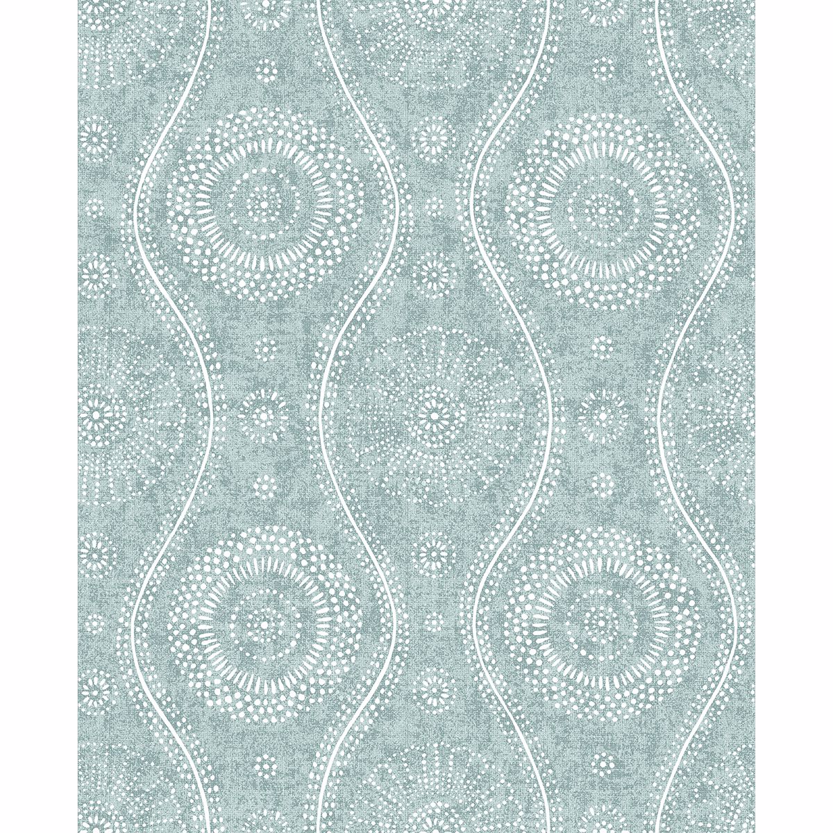 This playful medallion ogee is balanced by a vintage linen print background. The curving lines of the blue and white pattern draw the eye from floor to ceiling. Painterly is an unpasted, nonwoven wallpaper.