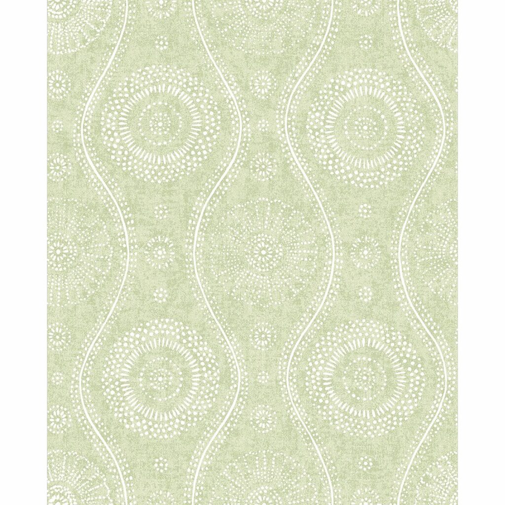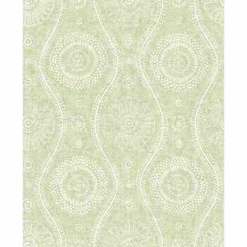 This playful medallion ogee is balanced by a vintage linen print background. The light green and white pattern feels fresh and invigorating. Painterly is an unpasted, nonwoven wallpaper.