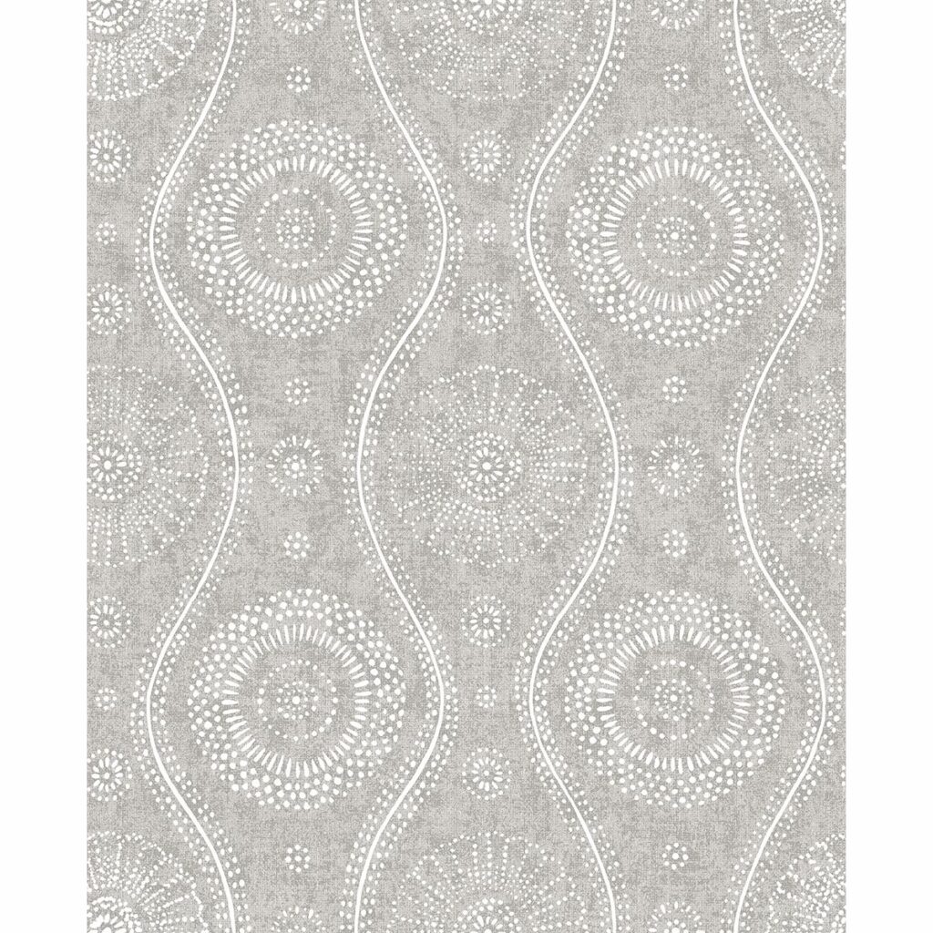 This playful medallion ogee is balanced by a vintage linen print background. The curving lines of the grey and white pattern draw the eye from floor to ceiling. Painterly is an unpasted, nonwoven wallpaper.