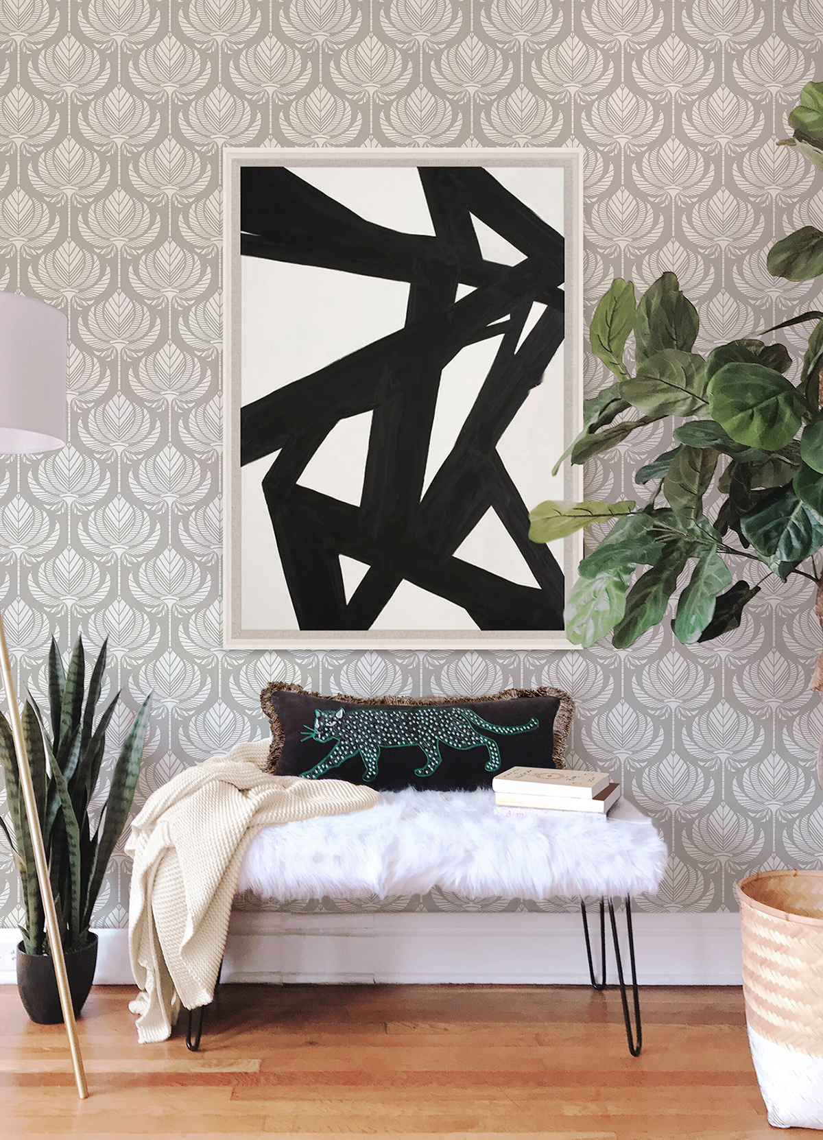This global print will add chic, bohemian flair to your interiors. The ogee pattern is formed from lotus-like fans inked in light grey against a deeper grey background. Palmier is an unpasted, non woven wallpaper.