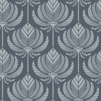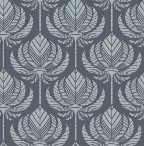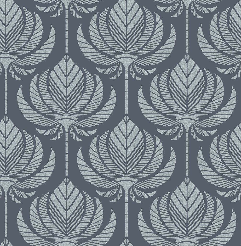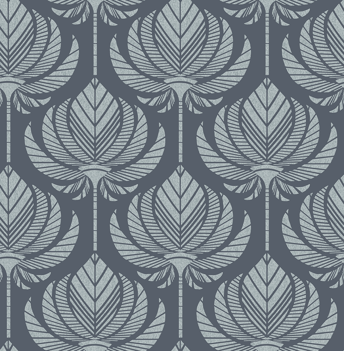 Bring bohemian mystique to your walls with this ogee wallpaper. The columns of lotus-shaped fans are inked in pale blue against a navy backdrop. Palmier is an unpasted, non woven wallpaper.