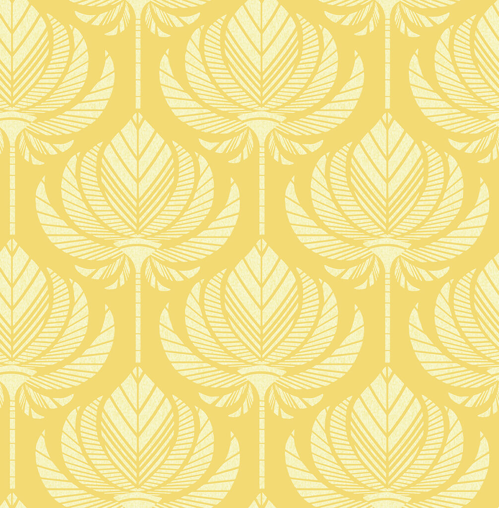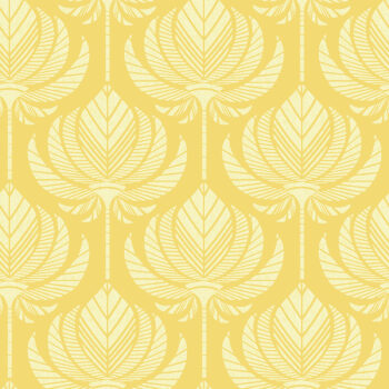 Enjoy sunny, global styling with this charming, bohemian wallpaper! The columns of lotus-shaped fans are inked in a pale yellow against a saturated, goldenrod backdrop. Palmier is an unpasted, non woven wallpaper.