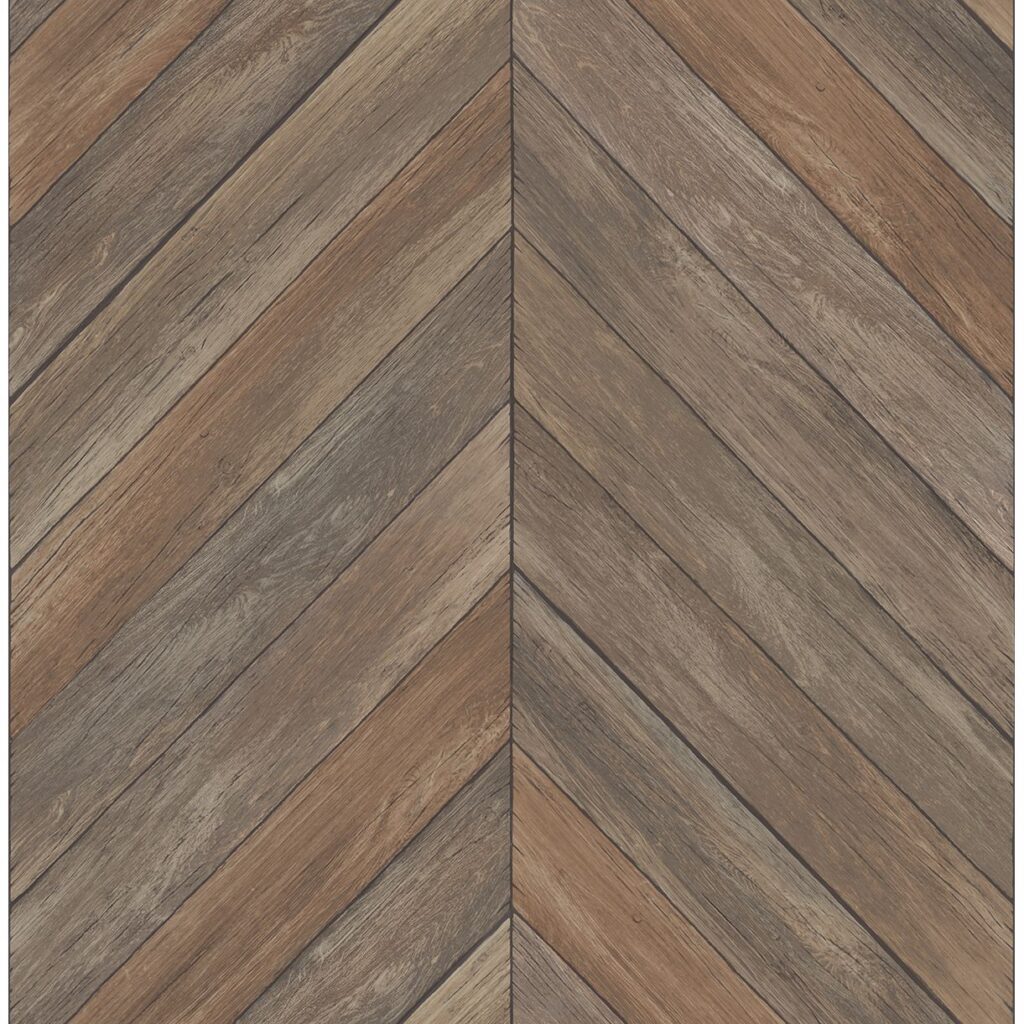 This faux wood wallpaper has a mix of cool and warm ash brown planks. Arranged in a chevron design, the print is modern and distinguished. A slightly weathered finish gives this pattern a reclaimed look.