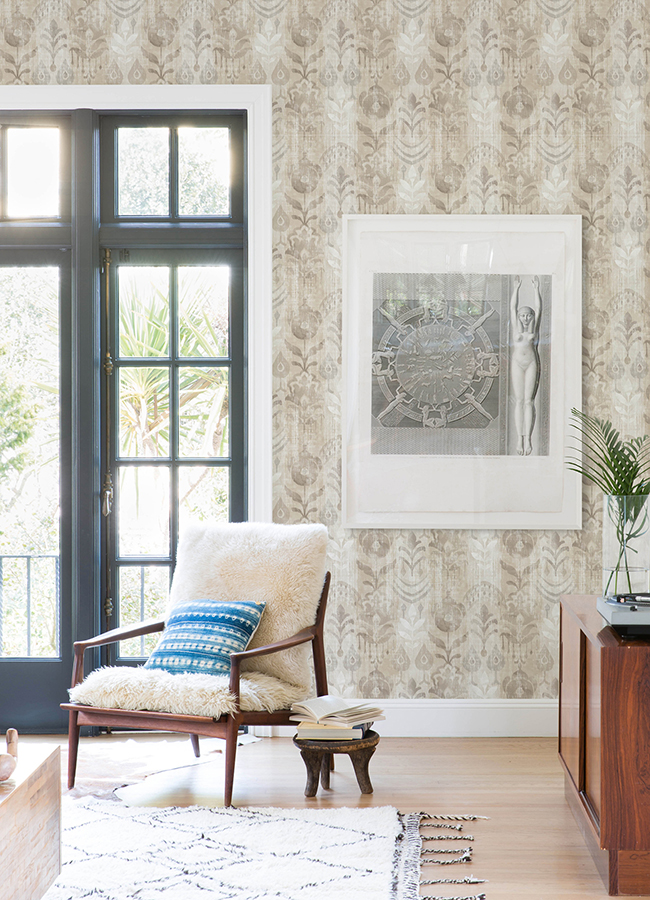 Bring a touch of well-traveled elegance to your interiors with this bohemian wallpaper. Block-printed florals decorate subtle shibori stripes, the neutral palette adding an extra element of sophistication to the design. Pavord is an unpasted, non woven wallpaper measuring 20.5 inches wide by 33 feet long, covering approximately 56.4 square feet per roll.