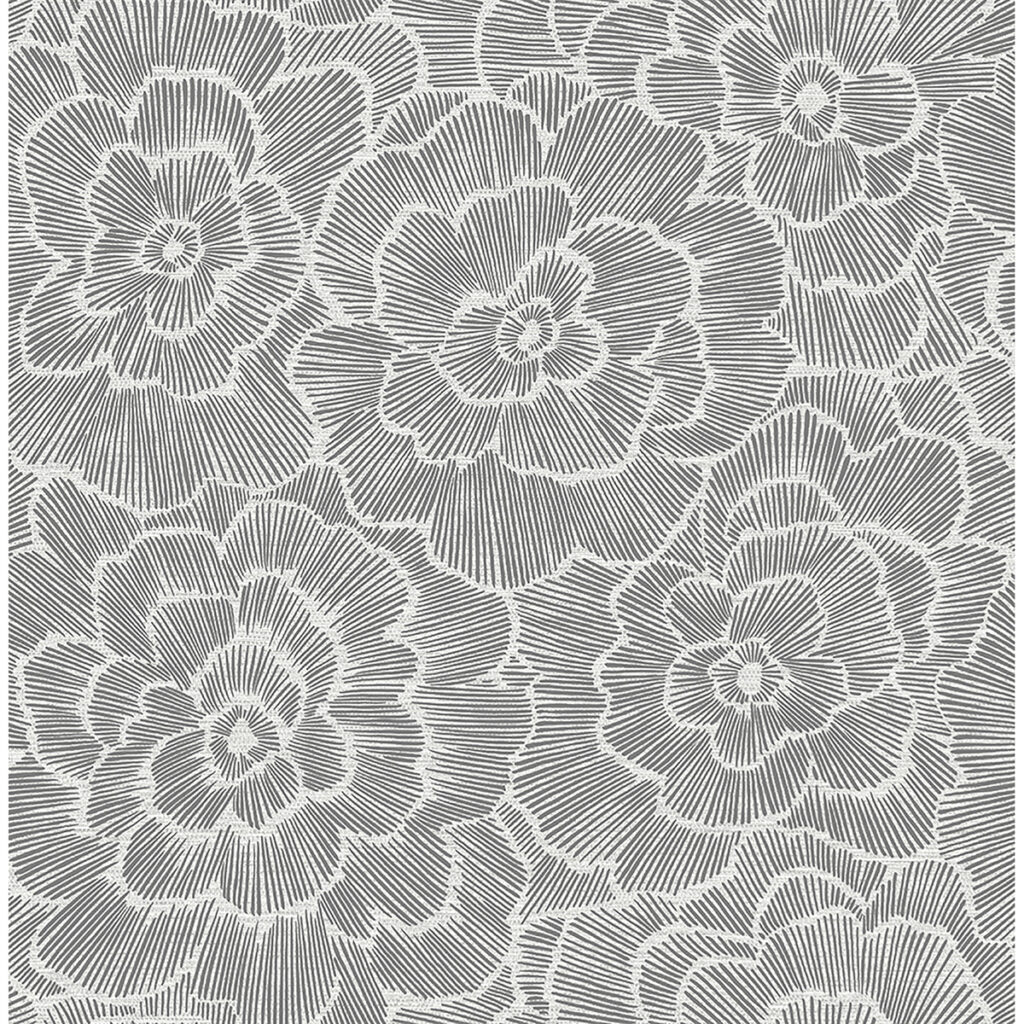Flowers seem to burst into bloom in this dynamic floral wallpaper. Set against a grey, grasscloth patterned backdrop, bold dashes of dark grey raised ink shape each petal and add a tactile element to the design. Periwinkle is an unpasted, non woven wallpaper.