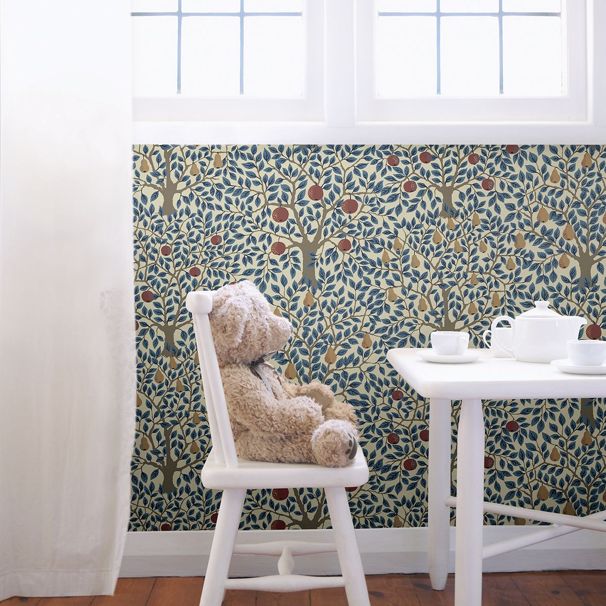 Luscious yellow pears and red apples hang from sprawling trees in this nature inspired wallpaper. Its brilliant blue leaves will add a splash of color and whimsy to rooms. Pomona is an unpasted, non woven wallpaper.