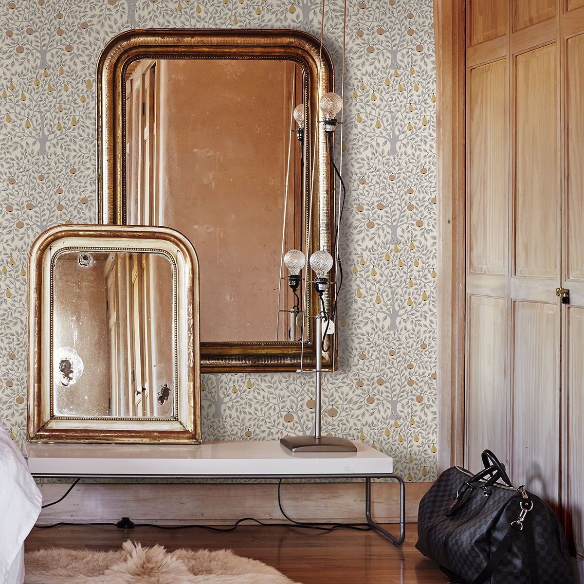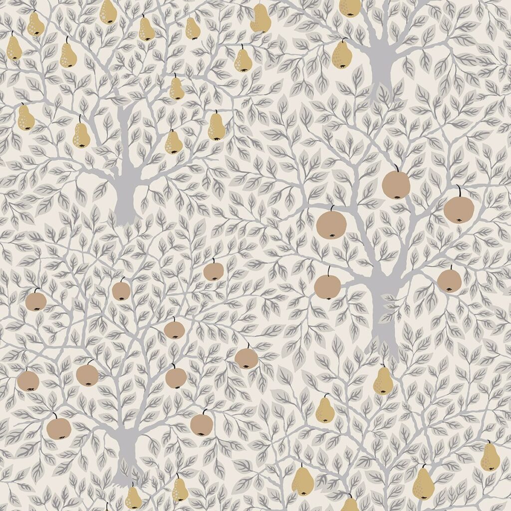 Light grey trees sprawl across an off-white background in this painterly wallpaper. Glimmering gold pears and apples add a touch of glamour to its nature inspired design. Pomona is an unpasted, non woven wallpaper.