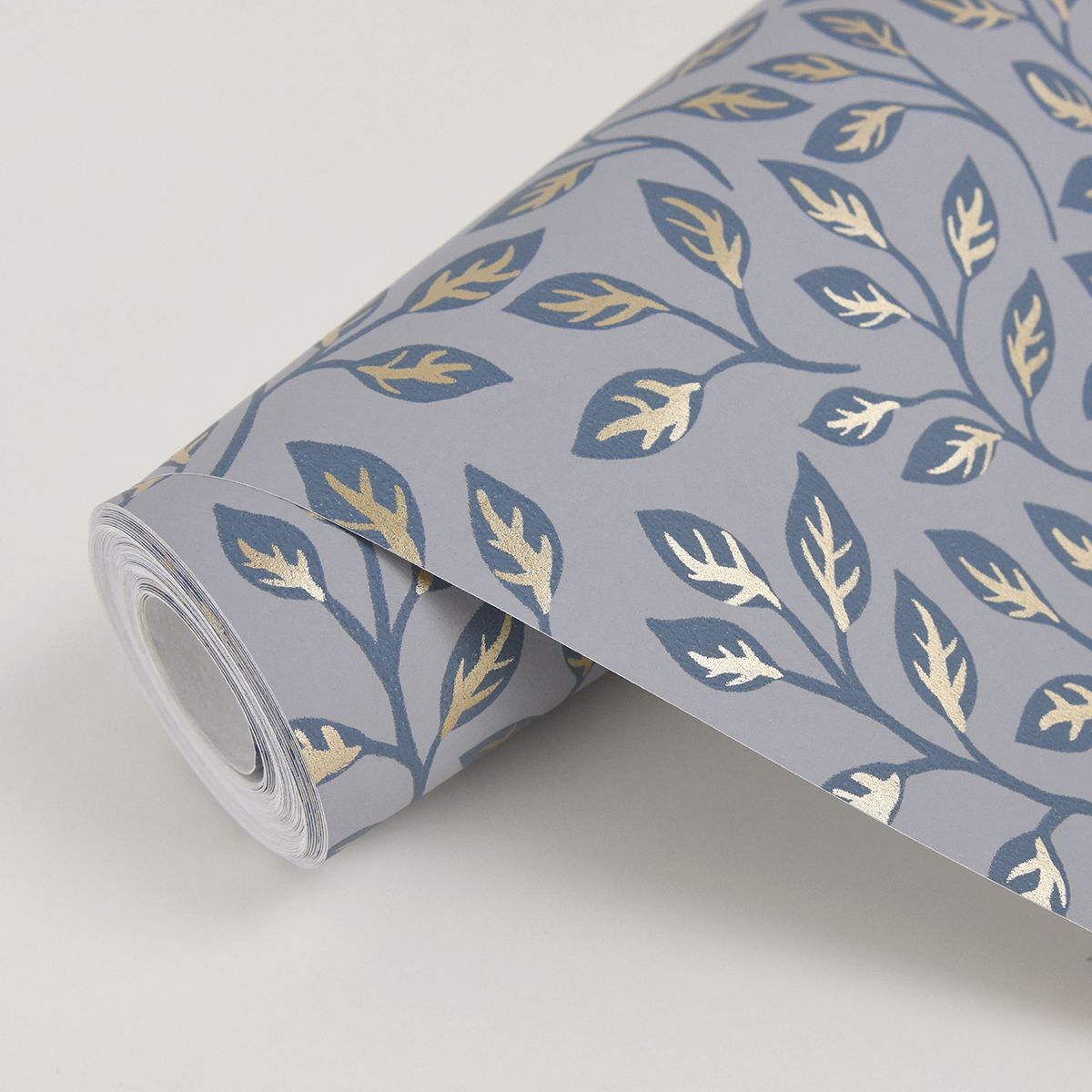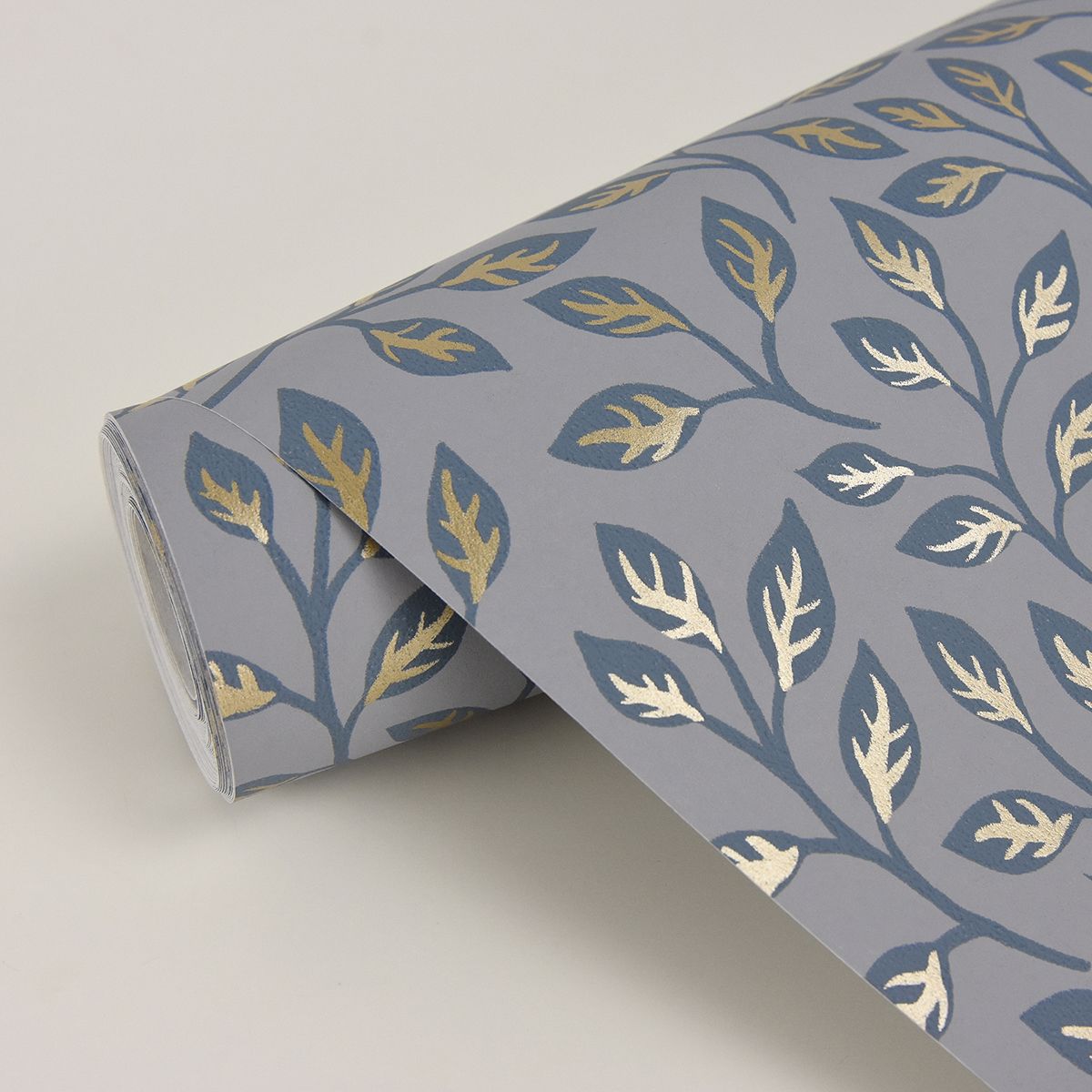Transform rooms into an ethereal garden with this stunning vines print. Curling slate leaves glimmer with gold accents against a rich lavender background. Posey is an unpasted, non woven wallpaper.