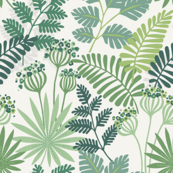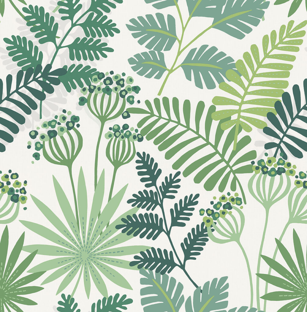 This whimsical botanical wallpaper lush, bohemian style to your home. The stylized plants are inked in numerous shades of green against a crisp white backdrop. Praslin is an unpasted, non woven wallpaper.