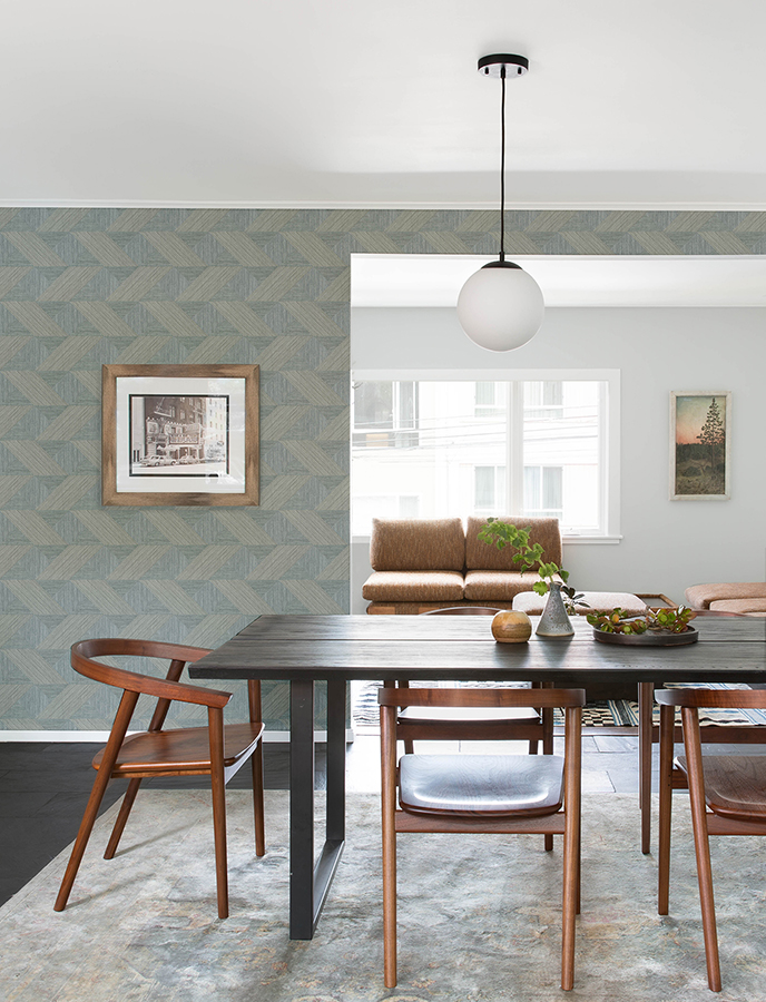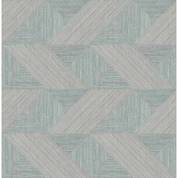This sophisticated geometric wallpaper has the intricate interwoven detailing of parquet flooring. The pattern is formed from dark green triangles, slate blue squares, and charcoal grey rhombi with varying, textured grain. Presley is an unpasted, non woven wallpaper measuring 20.5 inches wide by 33 feet long, covering approximately 56.4 square feet per roll.