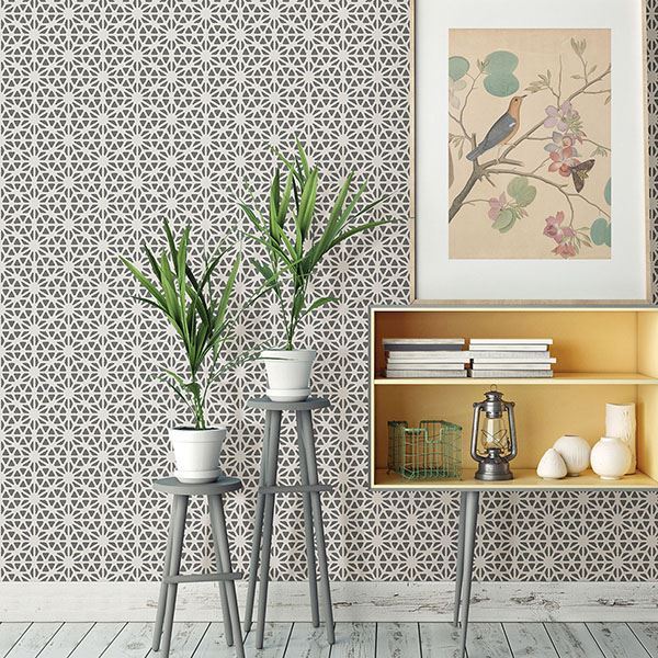 A modern geometric. The slate gray pattern looks crisp and composed printed in raised ink over a white background. Billie is an unpasted, non woven wallpaper.