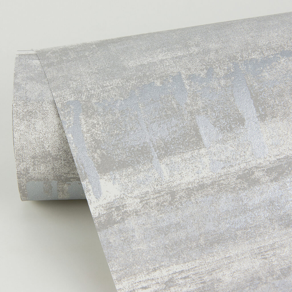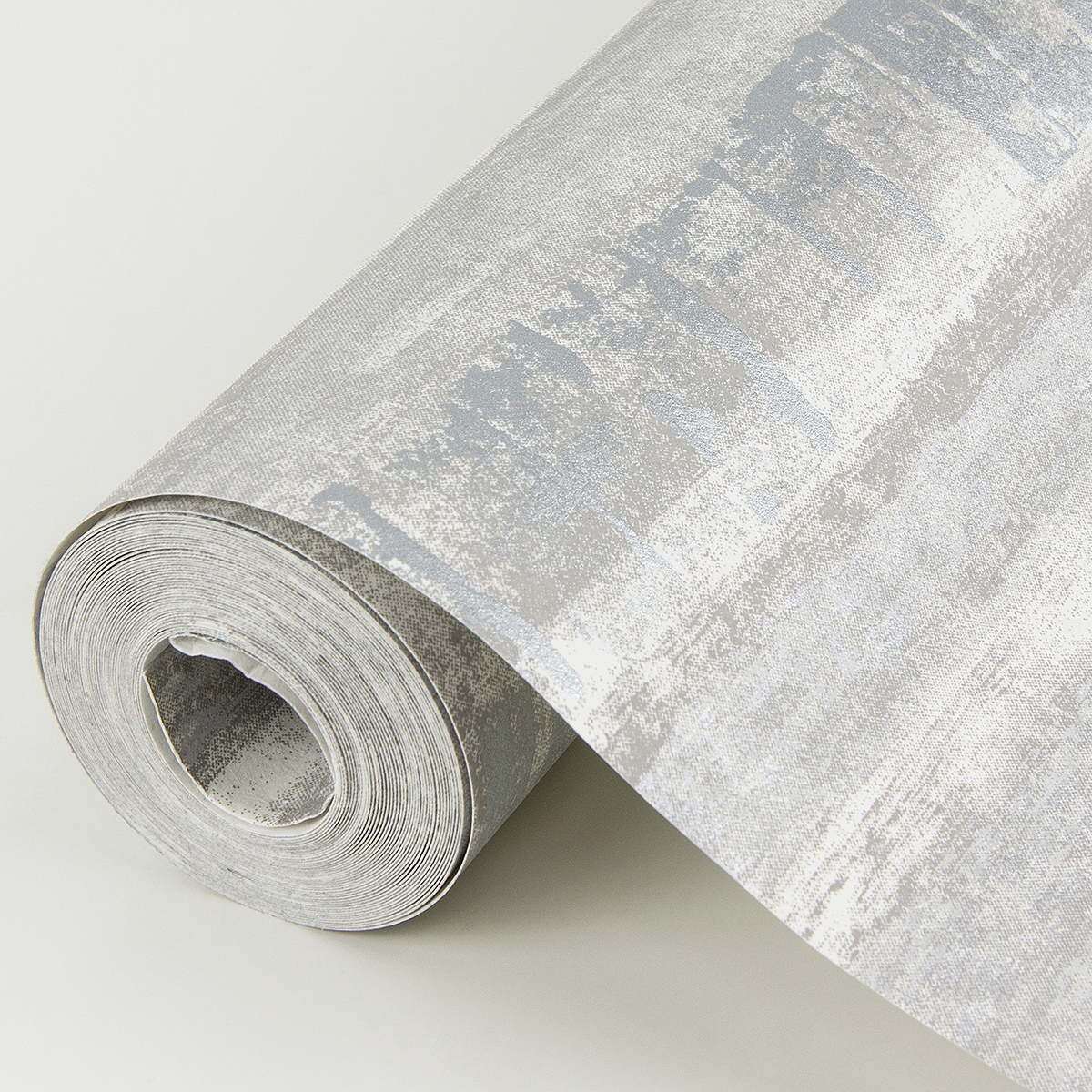 Brighten your home with the simple charms of this contemporary and dimensional wallpaper. Metallic squares are stamped side by side to form a silver stripe against a distressed light grey backdrop. Rakasa is an unpasted, foil on non woven wallpaper.