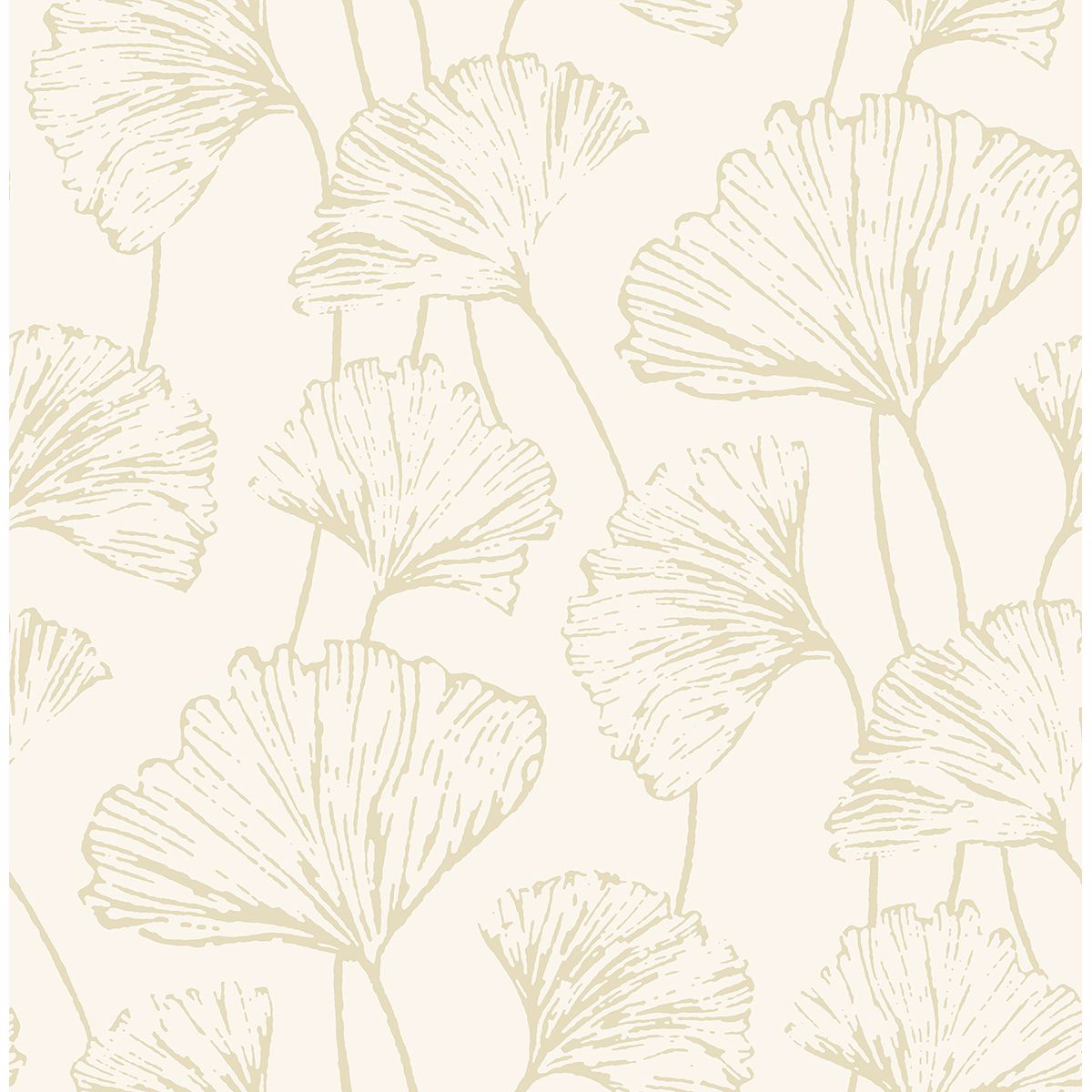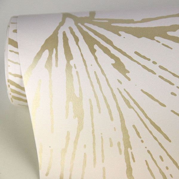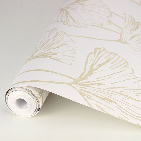 White and soft gold look lovely together in this botanical wallpaper. Ginkgo leaves catch the light with metallic ink over a white background. Reverie is a unpasted, non woven wallpaper.