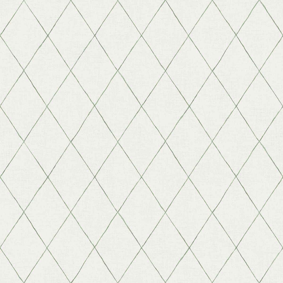 A classic geometric with a fresh energy, this wallpaper is perfect for brightening up rooms. A thing green diamond print saunters across a crisp white background, while distressed accents create a weathered look. Rhombus is an unpasted, non woven wallpaper.