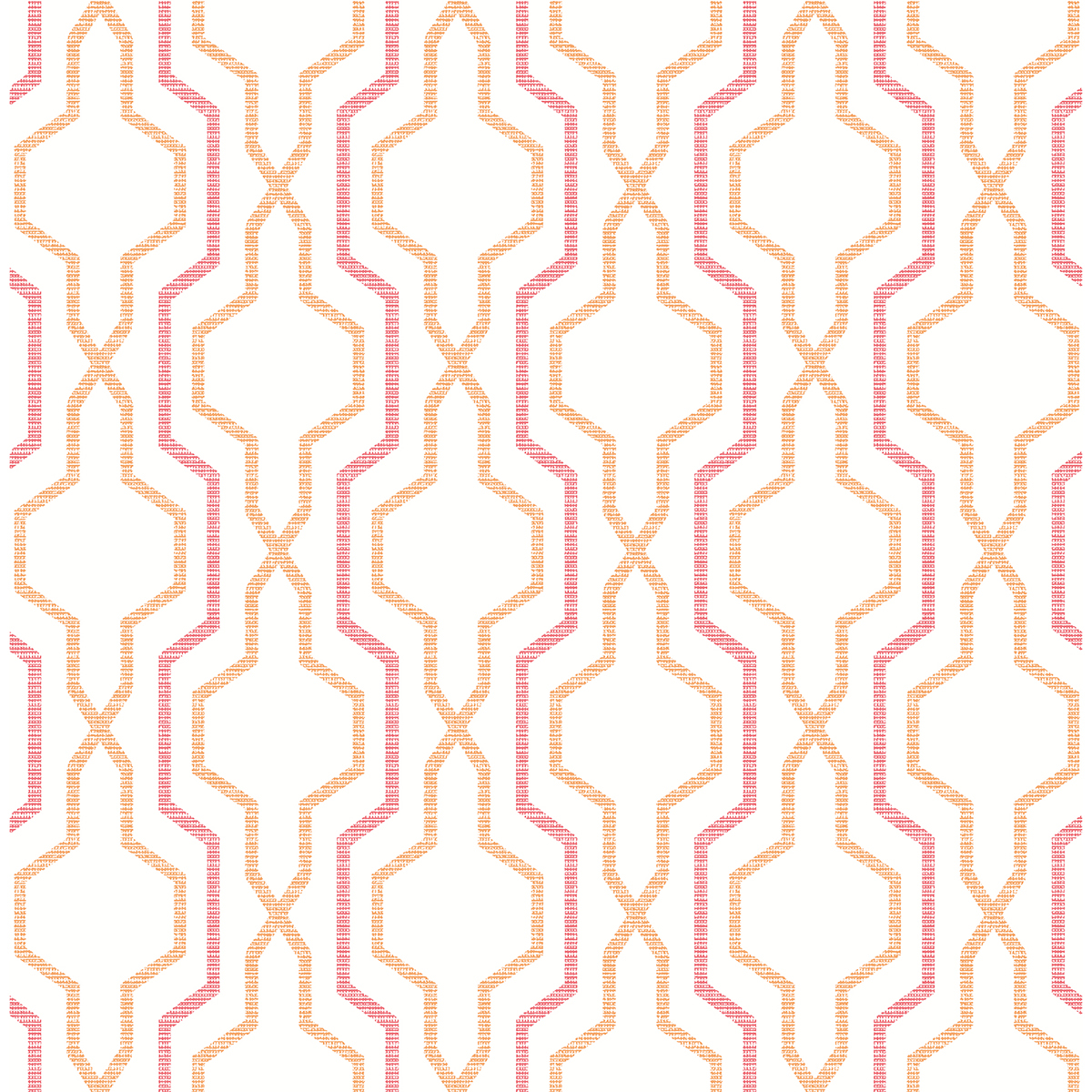 A classic design receives a colorful reinvention with this modern trellis wallpaper. The geometric chain link alternates between bright pink and orange for dynamic, contemporary flair. Rion is an unpasted, acrylic coated wallpaper.