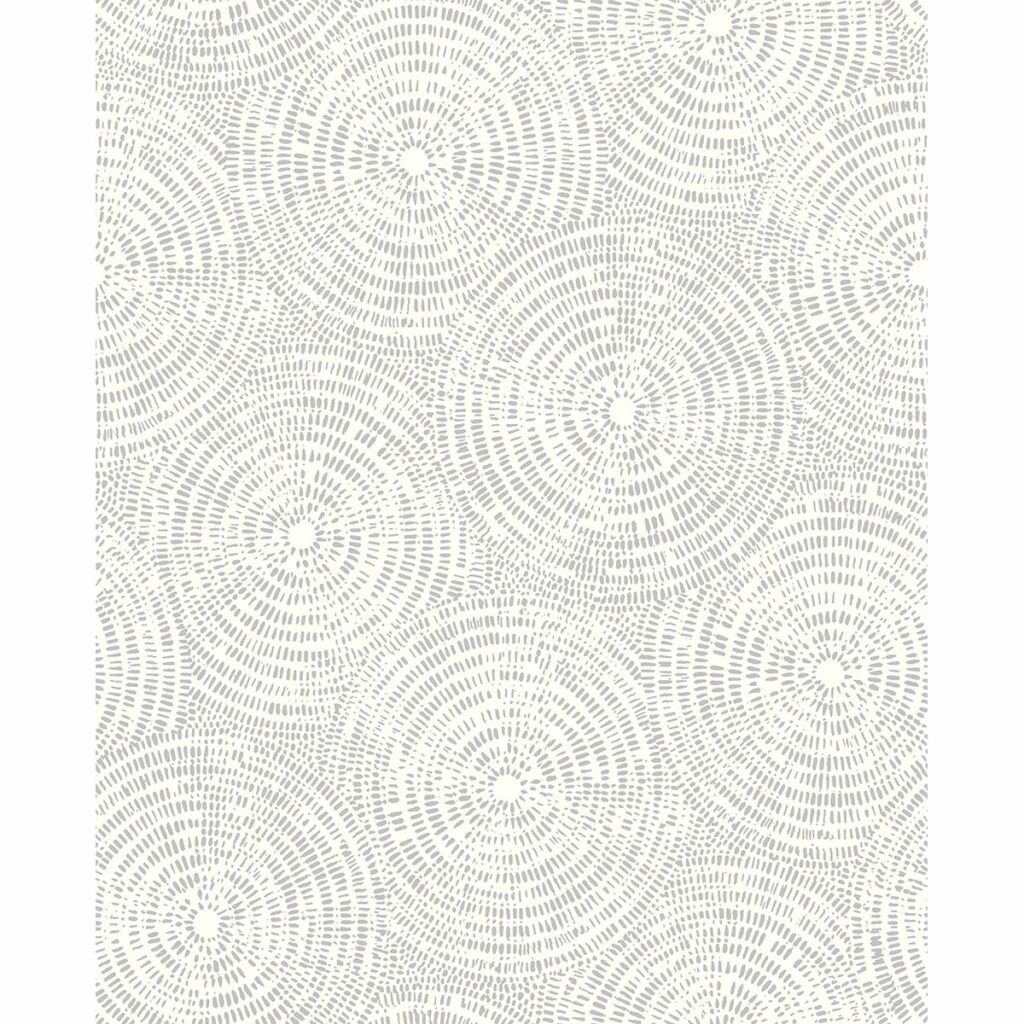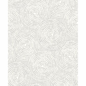 Concentric circles of dotted brushstrokes make up this modern shibori pattern. The grey print is raised slightly over a pearlescent white background. Vatten is an unpasted, non woven wallpaper.