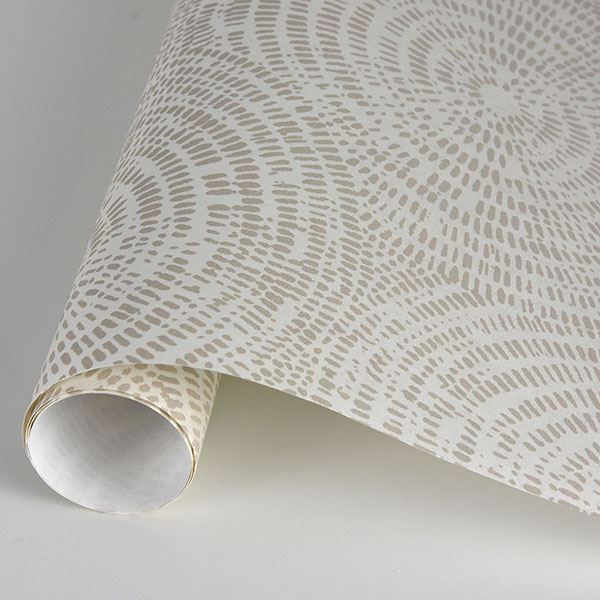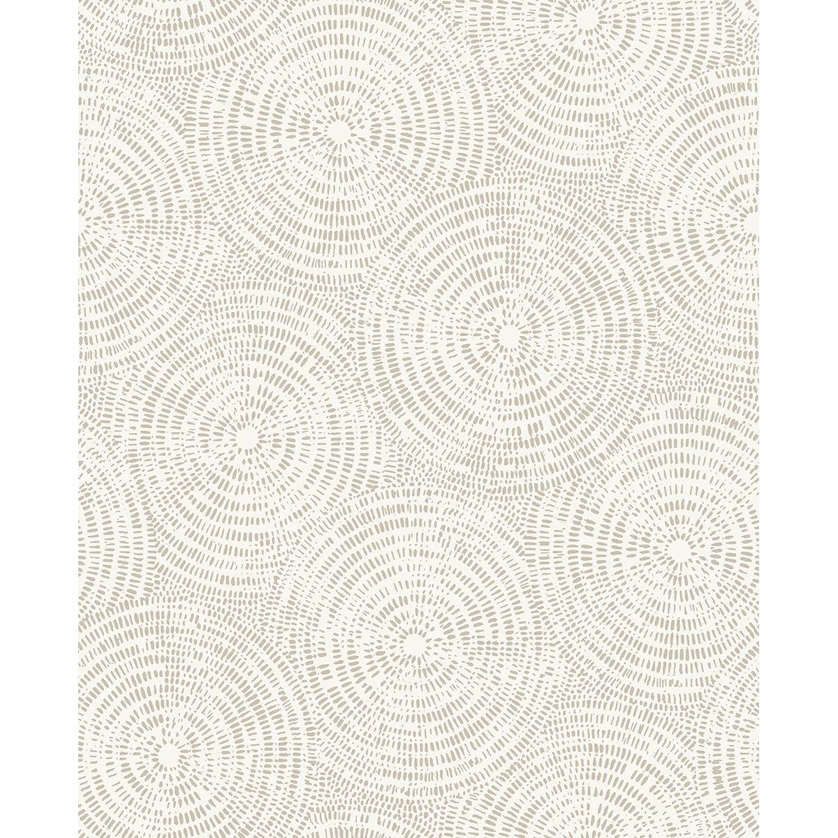 Concentric dotted circles form a shibori style pattern. The taupe design is printed in raised ink over a pearlescent beige background. Vatten is an unpasted, non woven wallpaper.