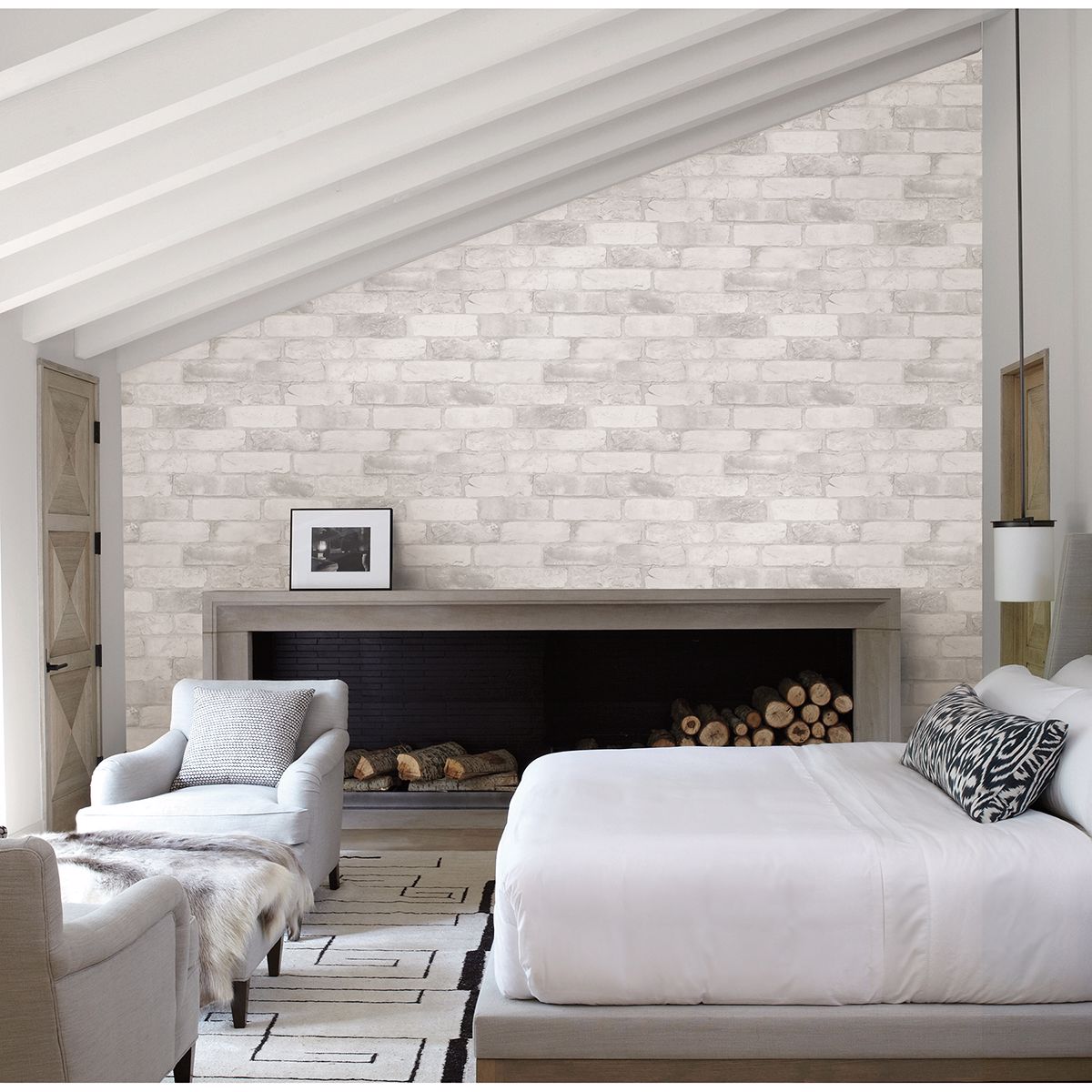 Brighten up your space with this farmhouse brick inspired wallpaper. Various shades of white lend to its airy aesthetic while raised inks emphasize its dimensional design. Rustin is an unpasted, non woven wallpaper.