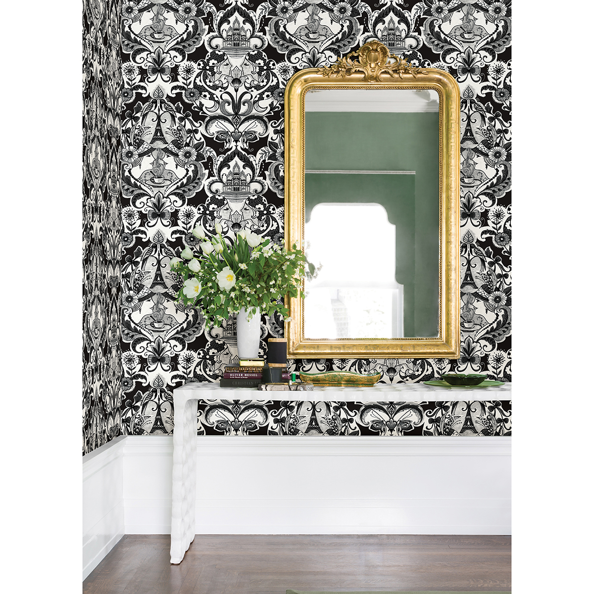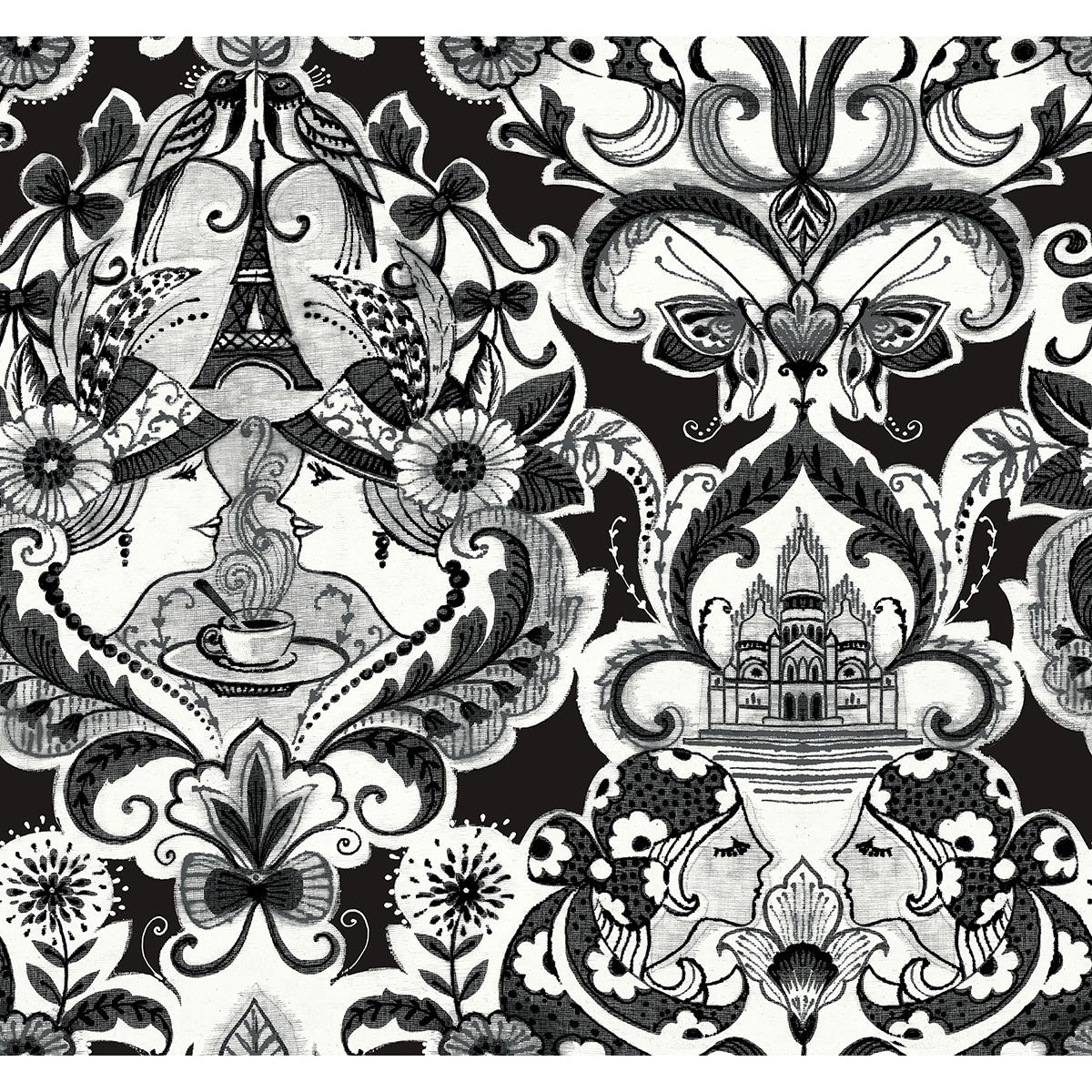 Bring Parisian high fashion to your home with this stylish damask wallpaper. The design features two women at a café in sight of the Eiffel Tower, illustrated in charcoals against a black backdrop. Sadie is an unpasted, acrylic coated wallpaper.