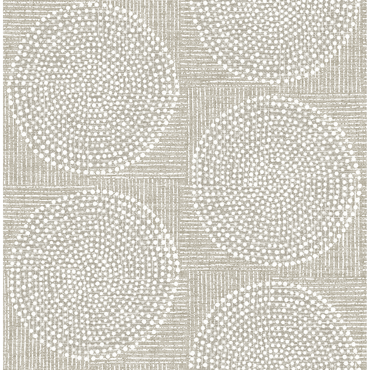 Soothing and airy, this wallpaper features circular medallions formed from concentric rings of individual white and grey dots. The light brown backdrop is accented with light grey raised ink lines that create a subtle, textured checkerboard. Salma is an unpasted, non woven wallpaper measuring 20.5 inches wide by 33 feet long, covering approximately 56.4 square feet per roll.