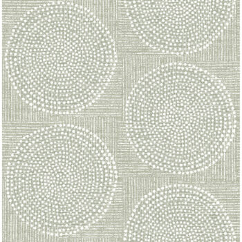Soothing and airy, this wallpaper features circular medallions formed from concentric rings of individual white and grey dots. The sage green backdrop is accented with white raised ink lines that create a subtle, textured checkerboard. Salma is an unpasted, non woven wallpaper measuring 20.5 inches wide by 33 feet long, covering approximately 56.4 square feet per roll.