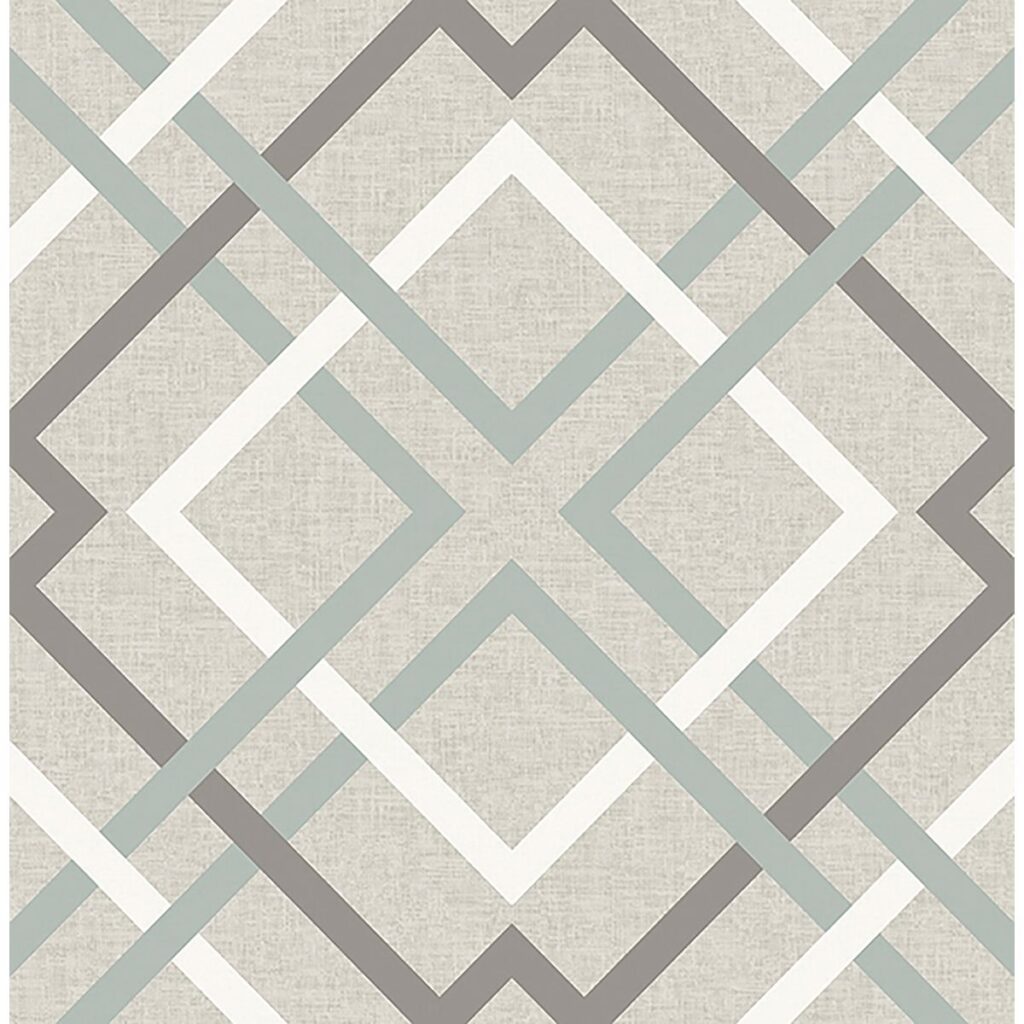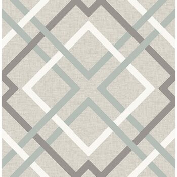 Interwoven blocks come together to form an intricate trellis pattern in this large scale design. Its taupe, white and slate blue geometric pattern effortlessly complements a neutral linen inspired background. Saltire Emile is an unpasted, non woven wallpaper.