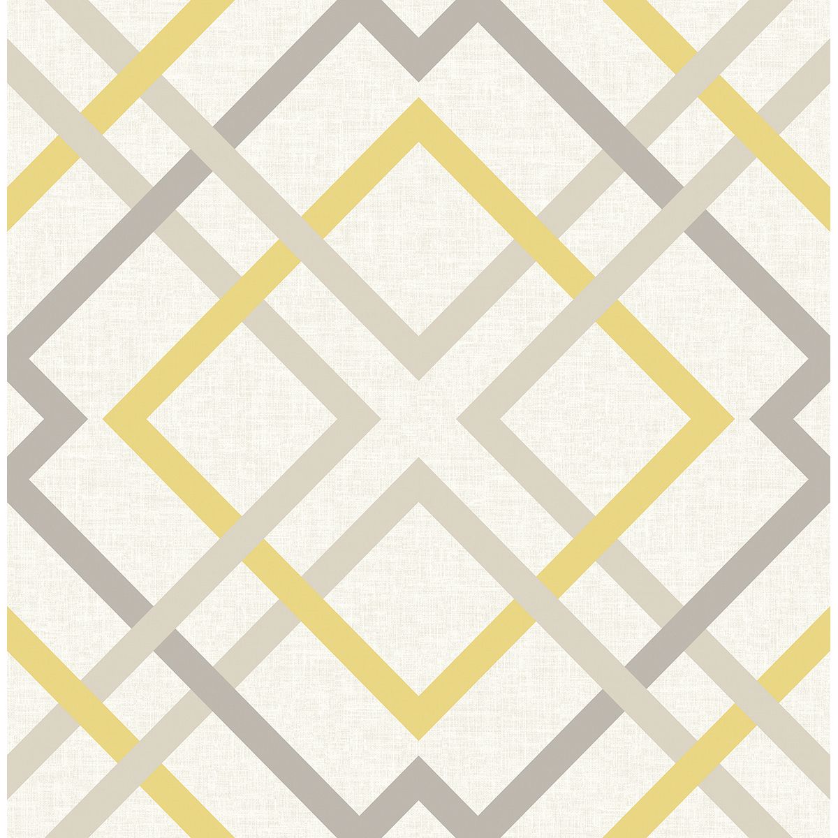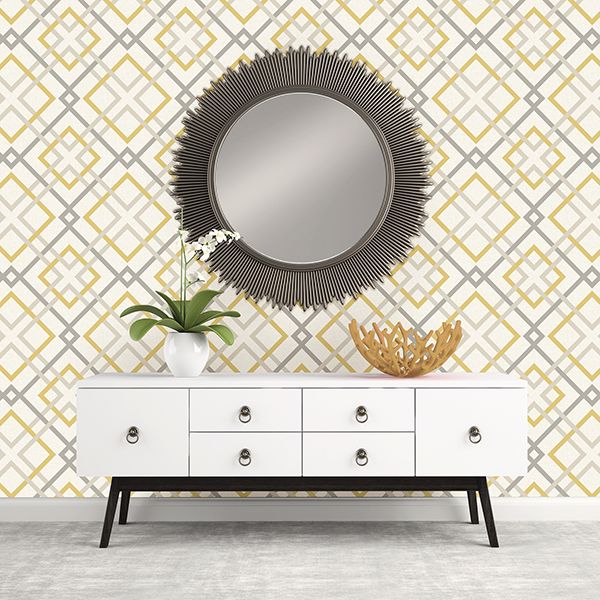 A modern wallpaper with a chic lattice pattern and beige linen background. The large scale design features mustard, neutral and metallic bronze hues. Saltire Emile is an unpasted, non woven wallpaper.