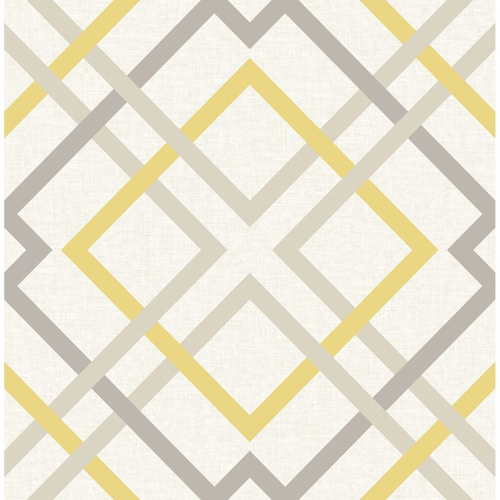 This modern wallpaper features a beige linen background with yellow and metallic bronze print. The large scale design has a variety of interwoven blocks that form an intricate trellis pattern.