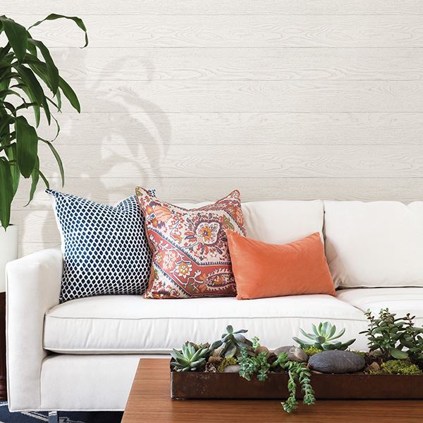 Get the look of shiplap walls with this white wallpaper. The five inch planks stretch continuously across the wall.