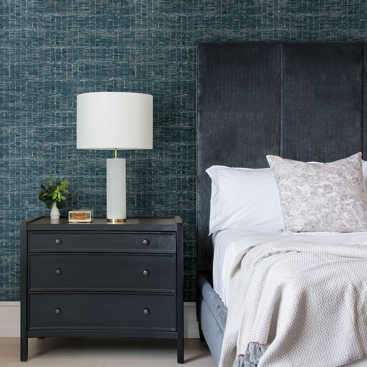 This textural design is chic and dimensional. The rich blue hues are elevated by layering fabric textures over subtle navy scales. Samos is an unpasted, non woven wallpaper.