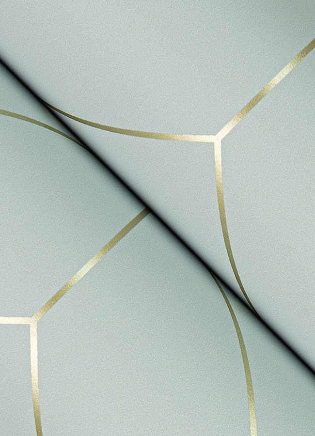 Subtle metallic detailing adds a hint of glamour to this chic geometric wallpaper. The diamond geometric grid is shaped by thin lines of gold along a delicate, light blue background. Sander is an unpasted, non woven wallpaper.