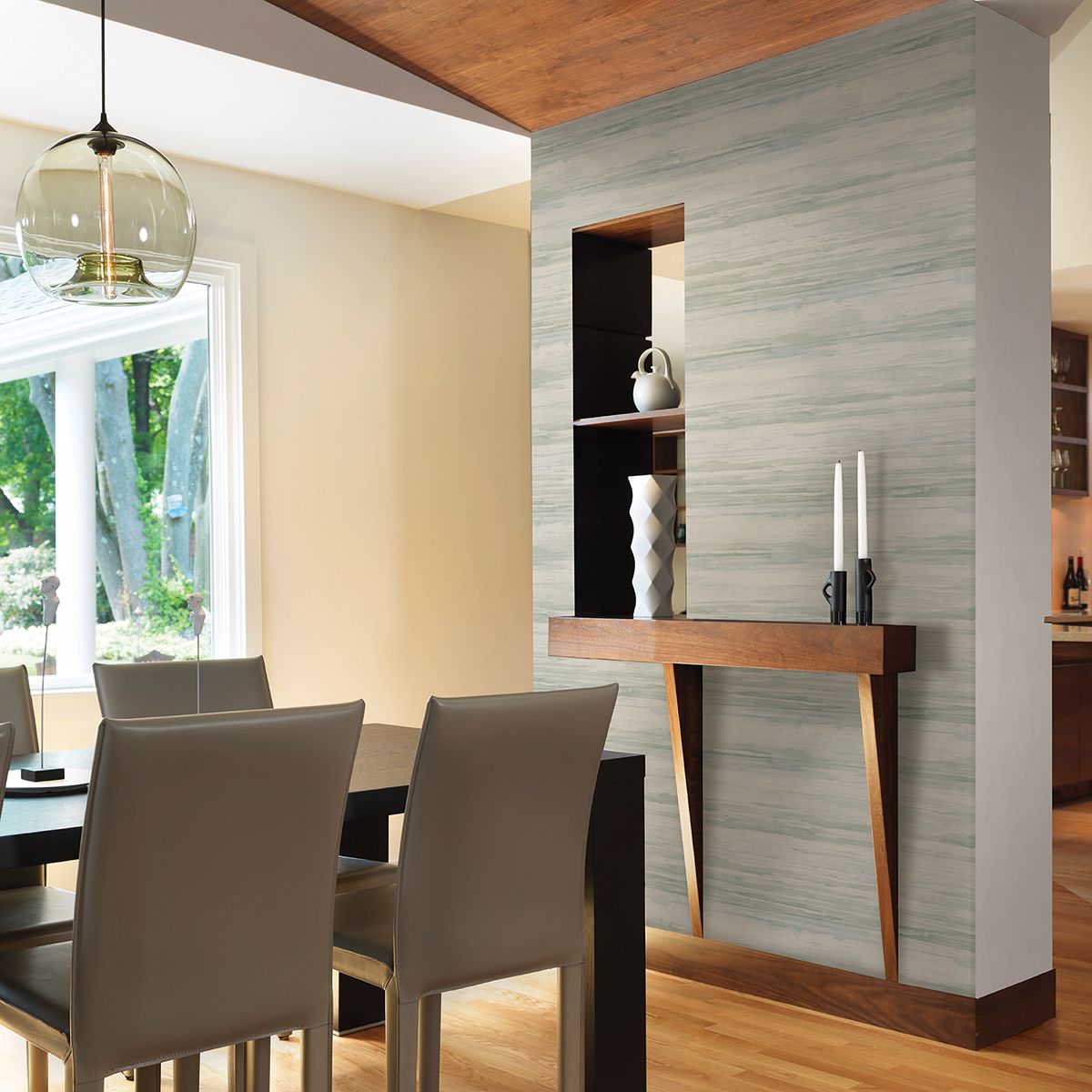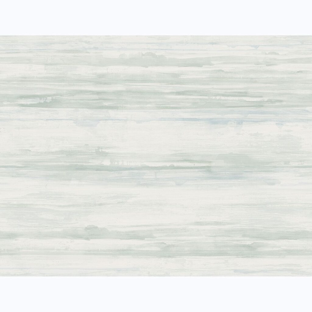 With seafoam, light blue and off-white hues, this abstract stripe wallpaper has a breezy energy. Its brushstroke style creates a dimensional effect. Sandhurst is an unpasted, acrylic coated paper wallpaper.