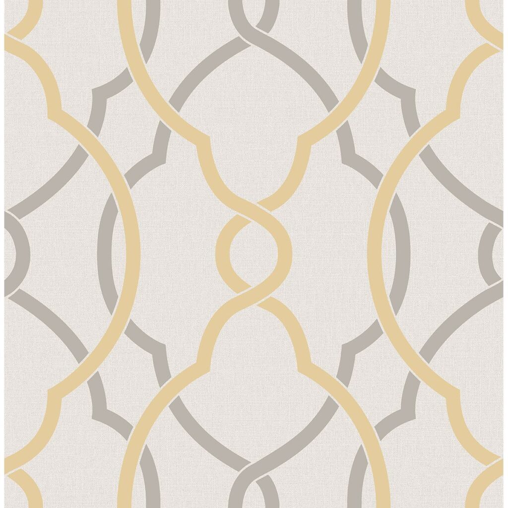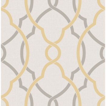 Grey and warm honey yellow lines flow over and under in this chic lattice wallpaper. A linen texture adds a soft dimension to the background in a light grey color. This balanced design brings a calm energy to the wall.