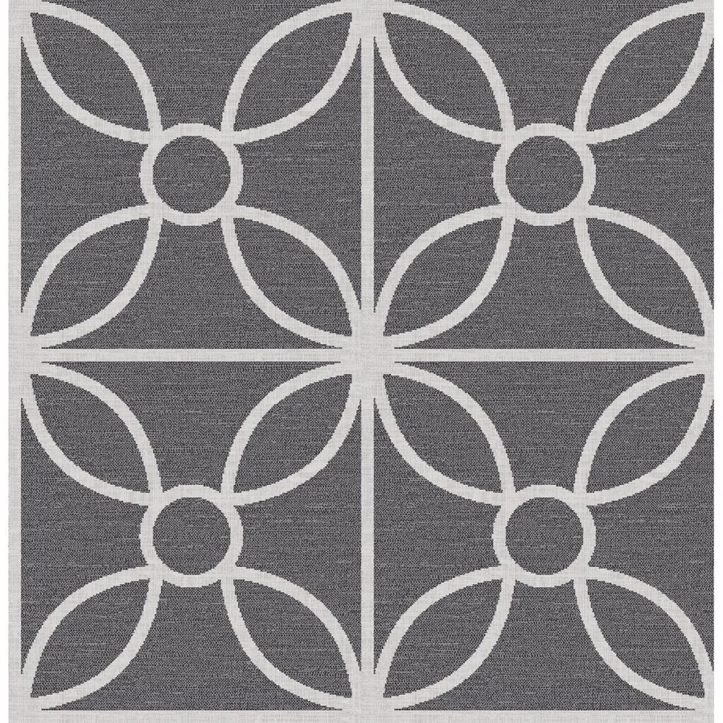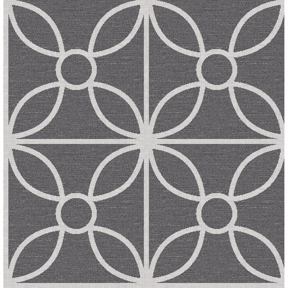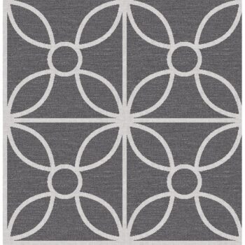 This wallpaper is a modern take on a classic floral tile. The geometric design pops with a light grey background and a charcoal black print. Raised inks create a tactile dimension on this large scale design.