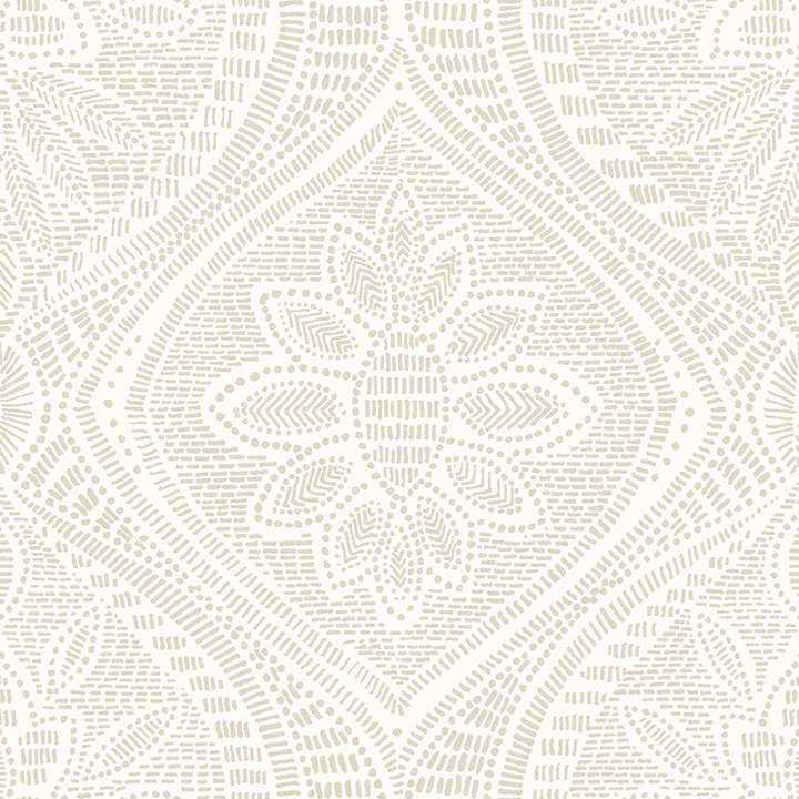 Subtle neutral hues pair perfectly with the intricate detailing of this ogee design. Featuring floral medallions framed by curving borders, this pattern is entirely shaped by tiny dashes of light grey raised inks. Scout is an unpasted, non woven wallpaper.