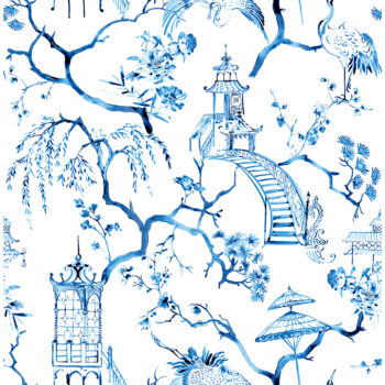 The timeless appeal of toile is elevated with modern touches. This compelling chinoiserie wallpaper features cranes, pagodas, parasols, and flowering trees, all depicted in rich blue watercolors occasionally imprinted with diamond detailing. Serena is an unpasted, non woven wallpaper.