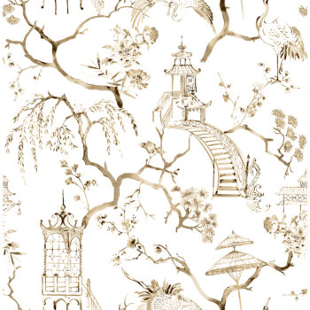 Timeless toile elegance is brought to new heights in this chic wallpaper design. This chinoiserie scene features pagodas, cranes, parasols, and flowering trees, all inked in brown watercolors occasionally imprinted wit a subtle diamond texture. Serena is an unpasted, non woven wallpaper.