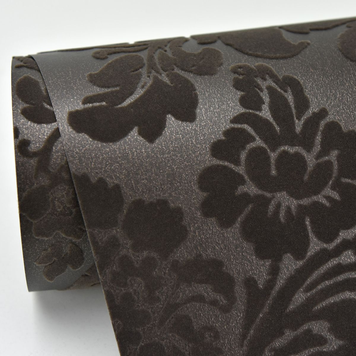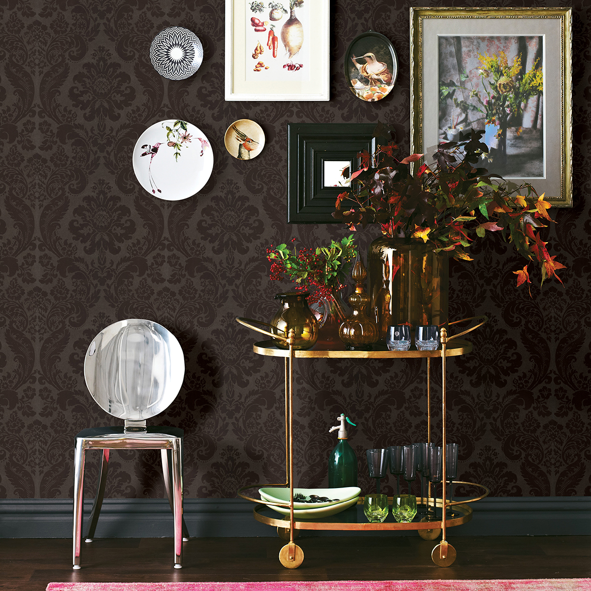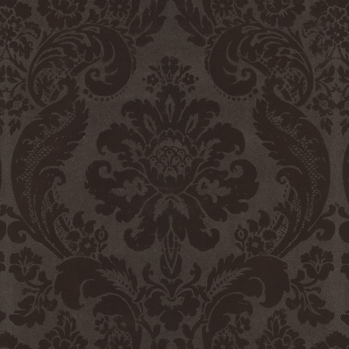 Rich like chocolate, this damask pattern is a treat for walls. Flocking and subtle pearlescent shimmer make this wallpaper a showstopper. Shadow is a non woven, unpasted wallpaper.