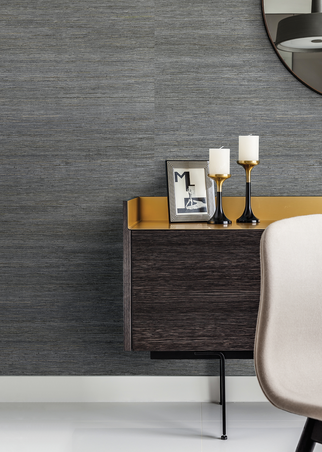 Elegant grasscloth is given a more masculine edge with this fibrous weave. The silver-grey and light brown grasses are woven together and finished with a light brushing of metallic silver. Shandong is an unpasted, grasscloth wallpaper.