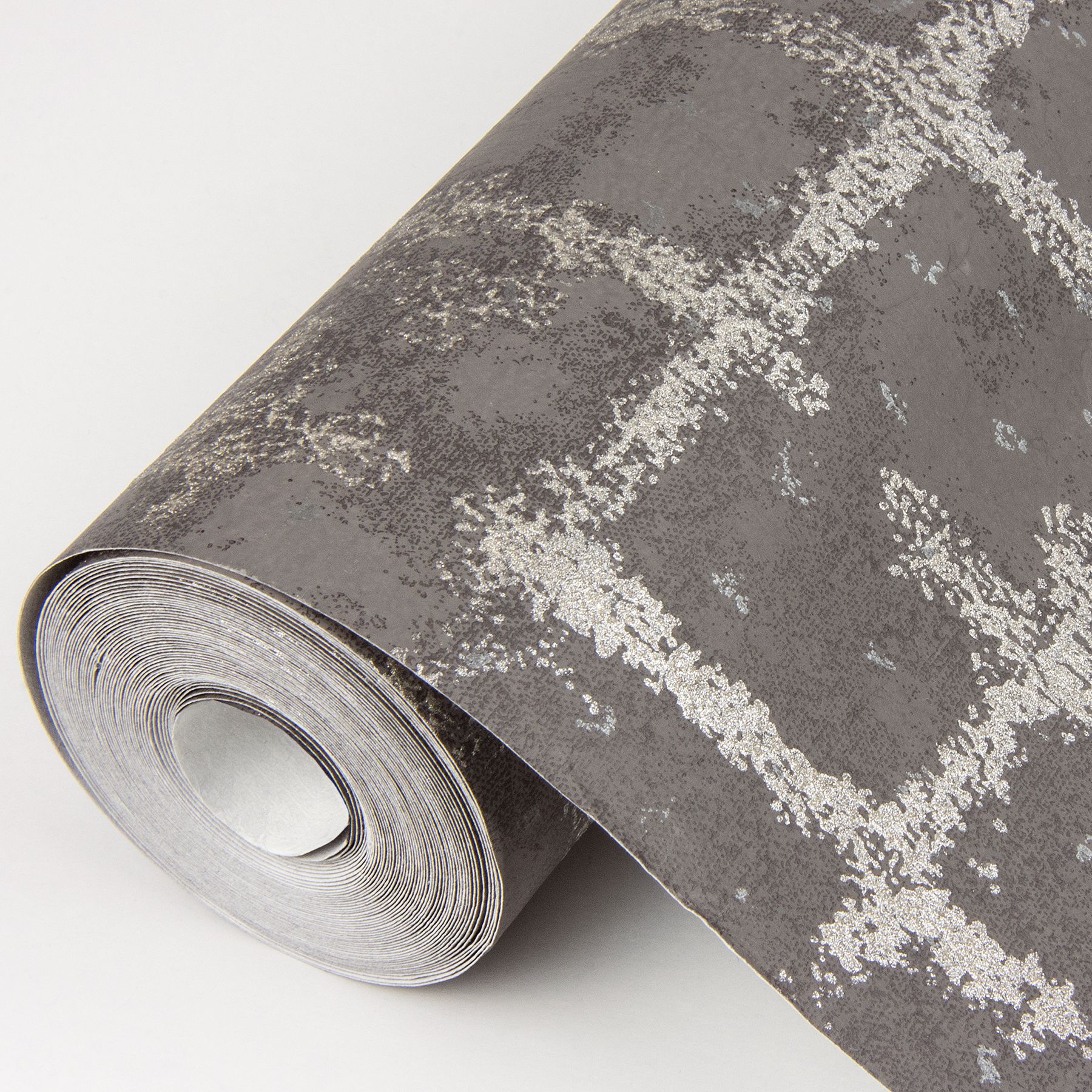Bold and moody with a deep charcoal hue, this wallpaper has a glamorous look. With glitter and silver details, this design shimmers with a chic and timeless look. Shea is an unpasted, non-woven wallpaper.