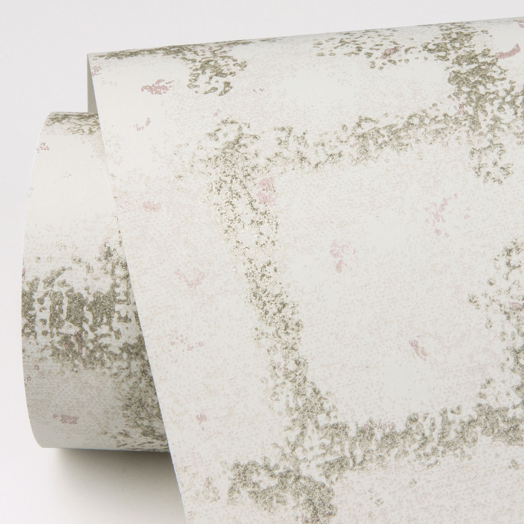 Retro meets contemporary in this metallic design. With off-white, gold, and dark pink hues, this wallpaper creates an effortlessly clean and dimensional look. Shea is an unpasted, non-woven wallpaper.
