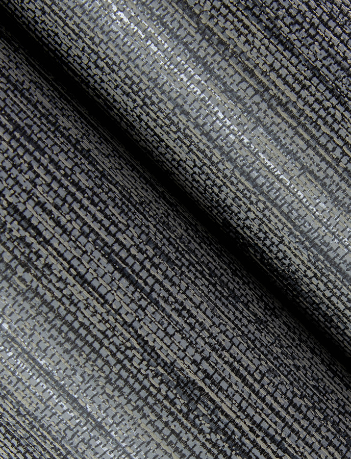 Faux grasscloth offers all the textural sophistication of authentic grass with added ease of maintenance. This timeless option features a foundation of dark grey streaked with black, all finished with a metallic silver shimmer. Sheehan is an unpasted, non woven wallpaper measuring 20.5 inches wide by 33 feet long, covering approximately 56.4 square feet per roll.