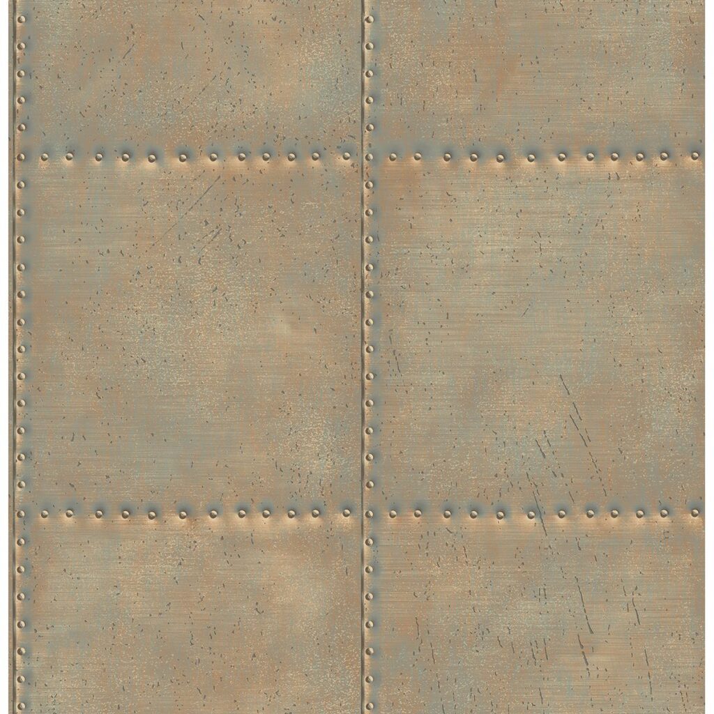 This metal wallpaper has a beautiful patina with a verdigris finish. Copper and turquoise combine for a vintage look while a riveted pattern gives adds an industrial element.